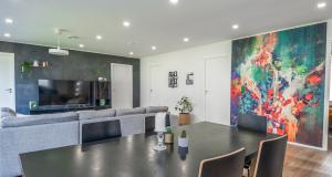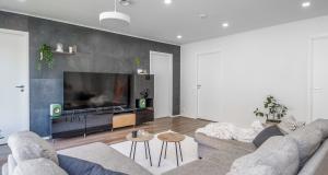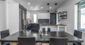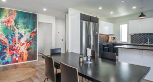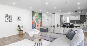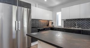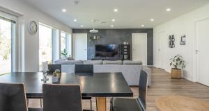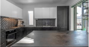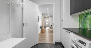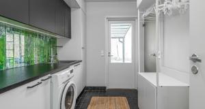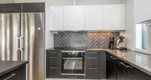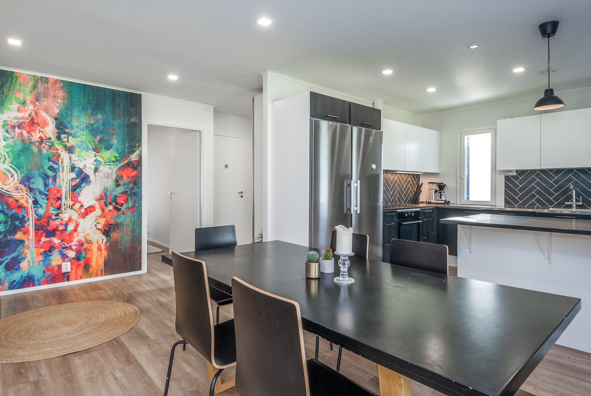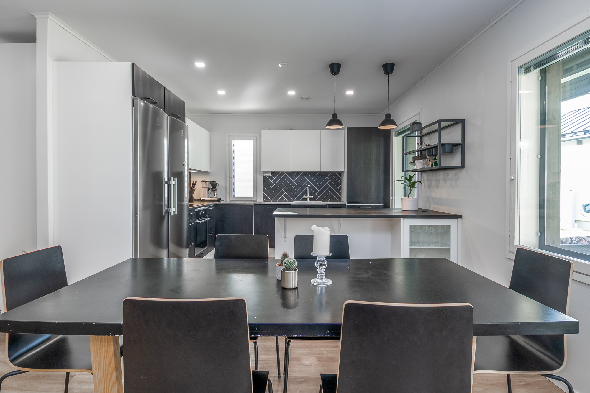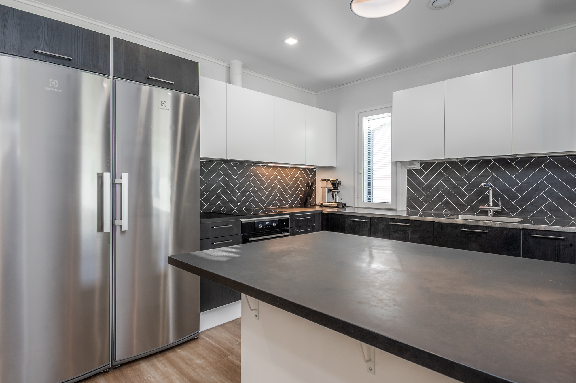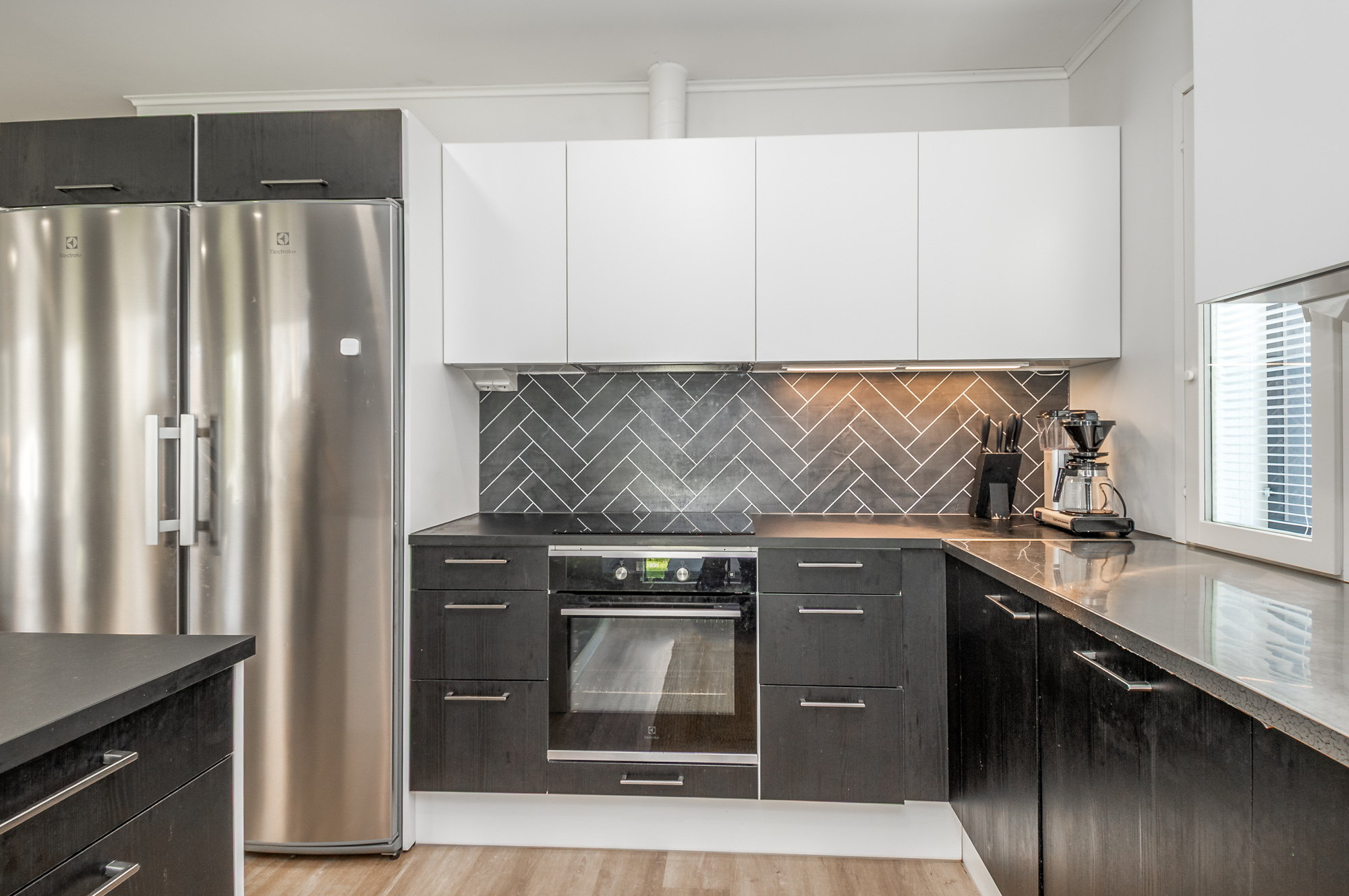 Keittiö yhtä, avaraa tilaa ruokailutilan ja olohuoneen kanssa. Korkeat jää- ja pakastinkaappi, kalusteuuni, induktioliesi, liesituuletin, integroitu astianpesukone.