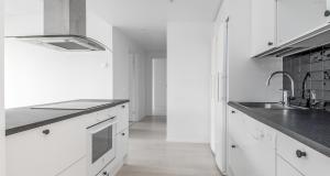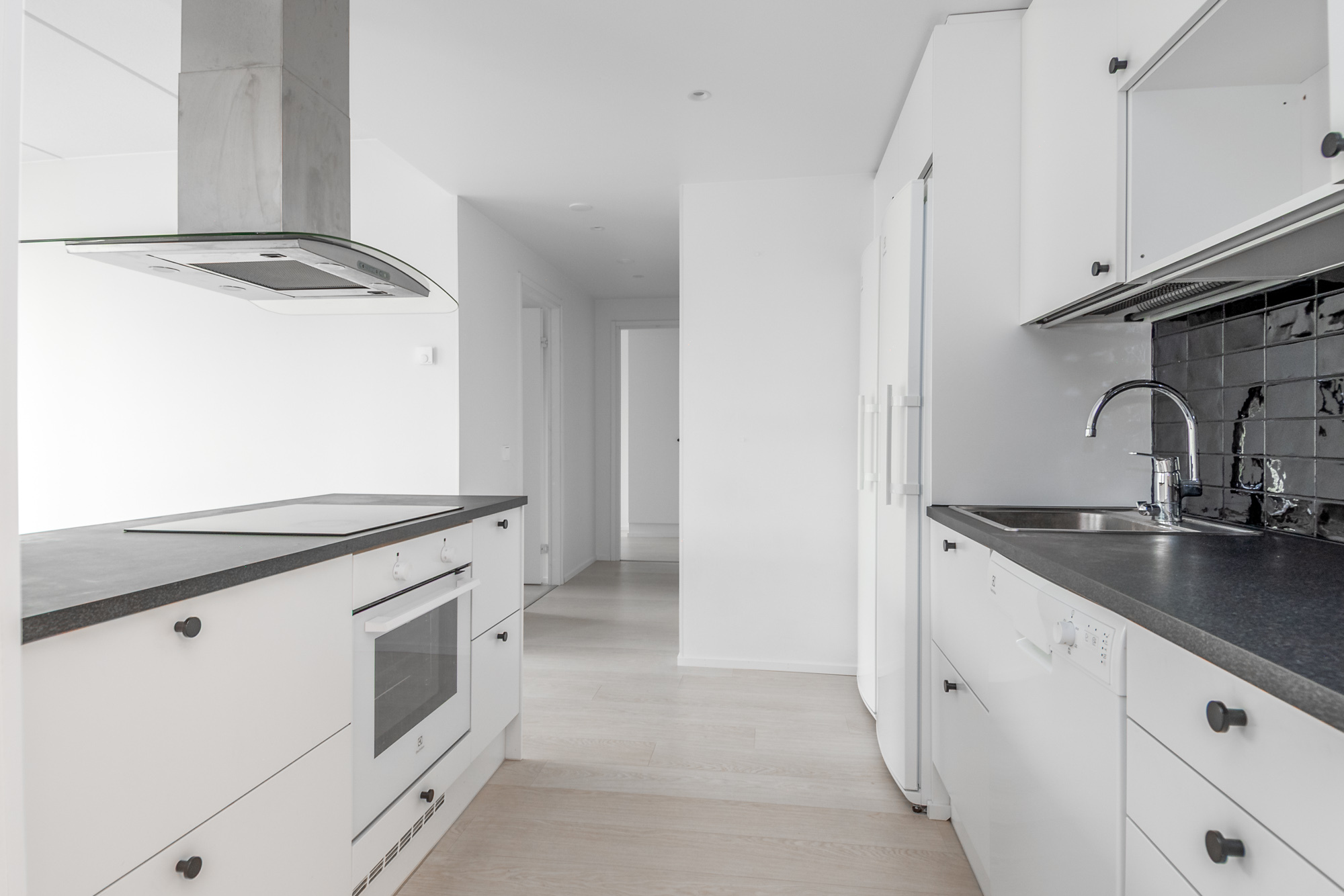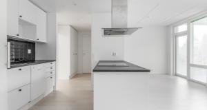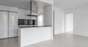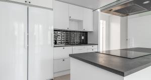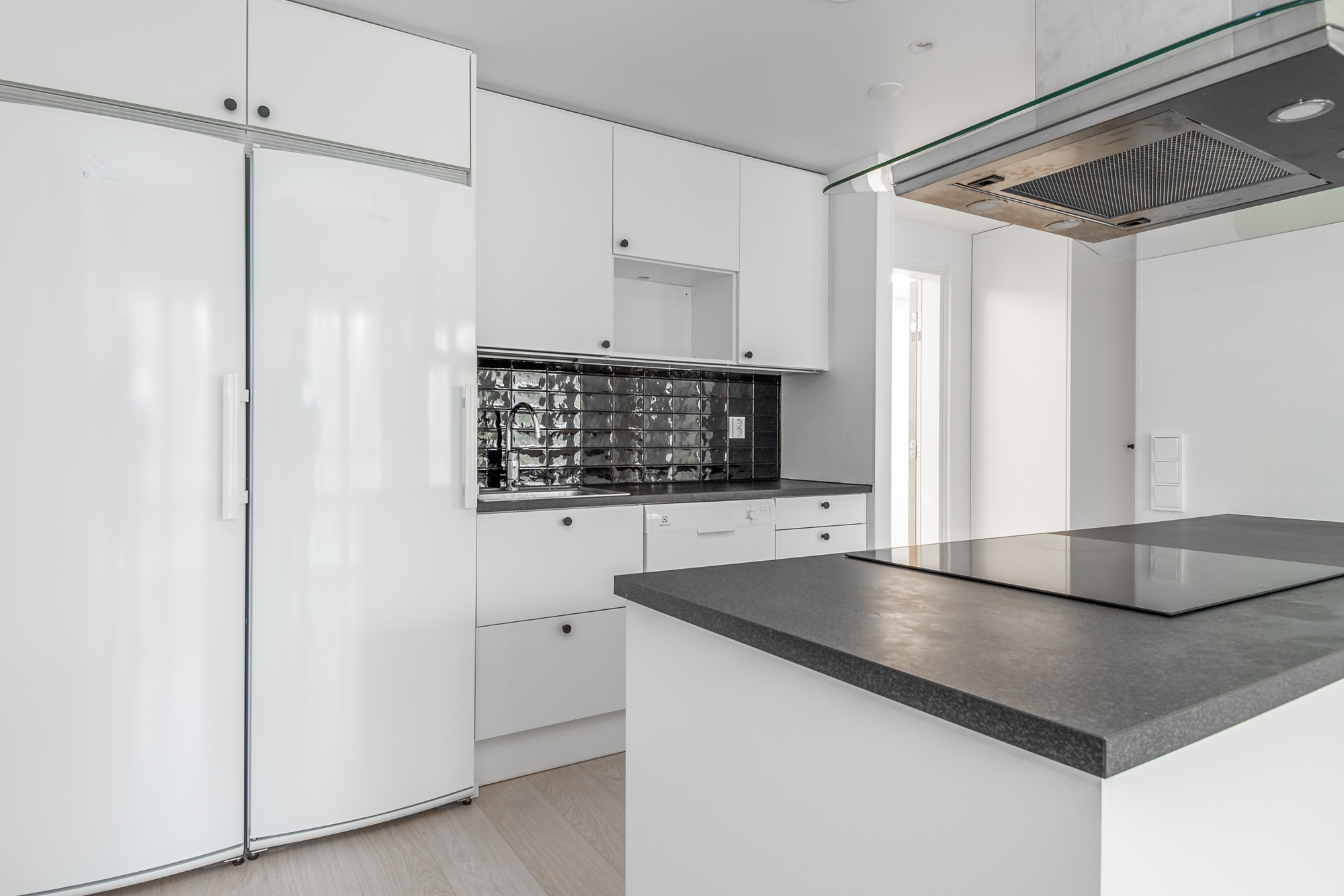 Keittiö ja olohuone yhtä tilaa. Korkeat jääkaappi ja pakastinkaappi, induktioliesi, liesituuletin, kalusteuuni, astianpesukone.