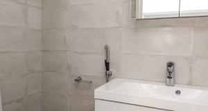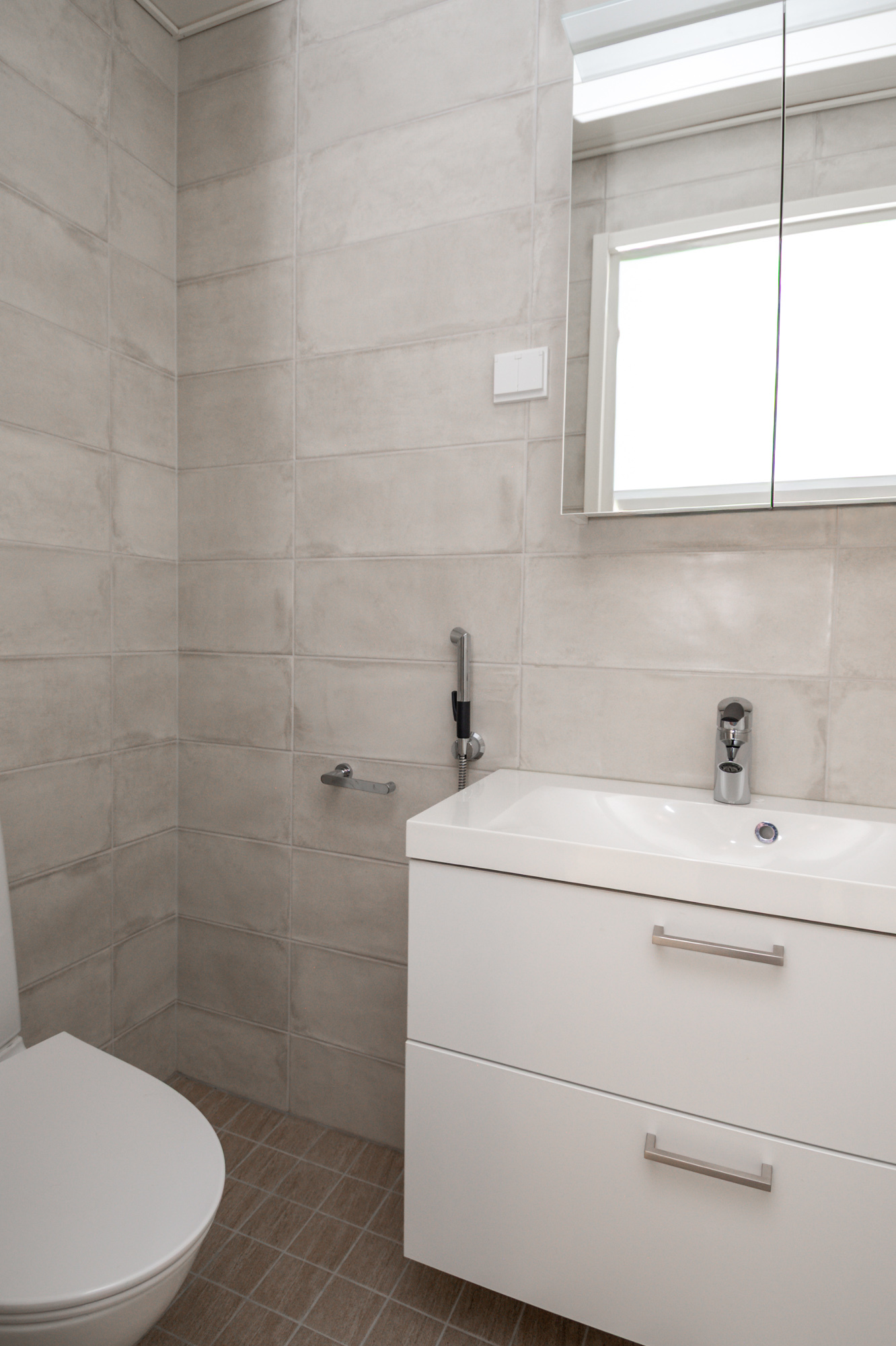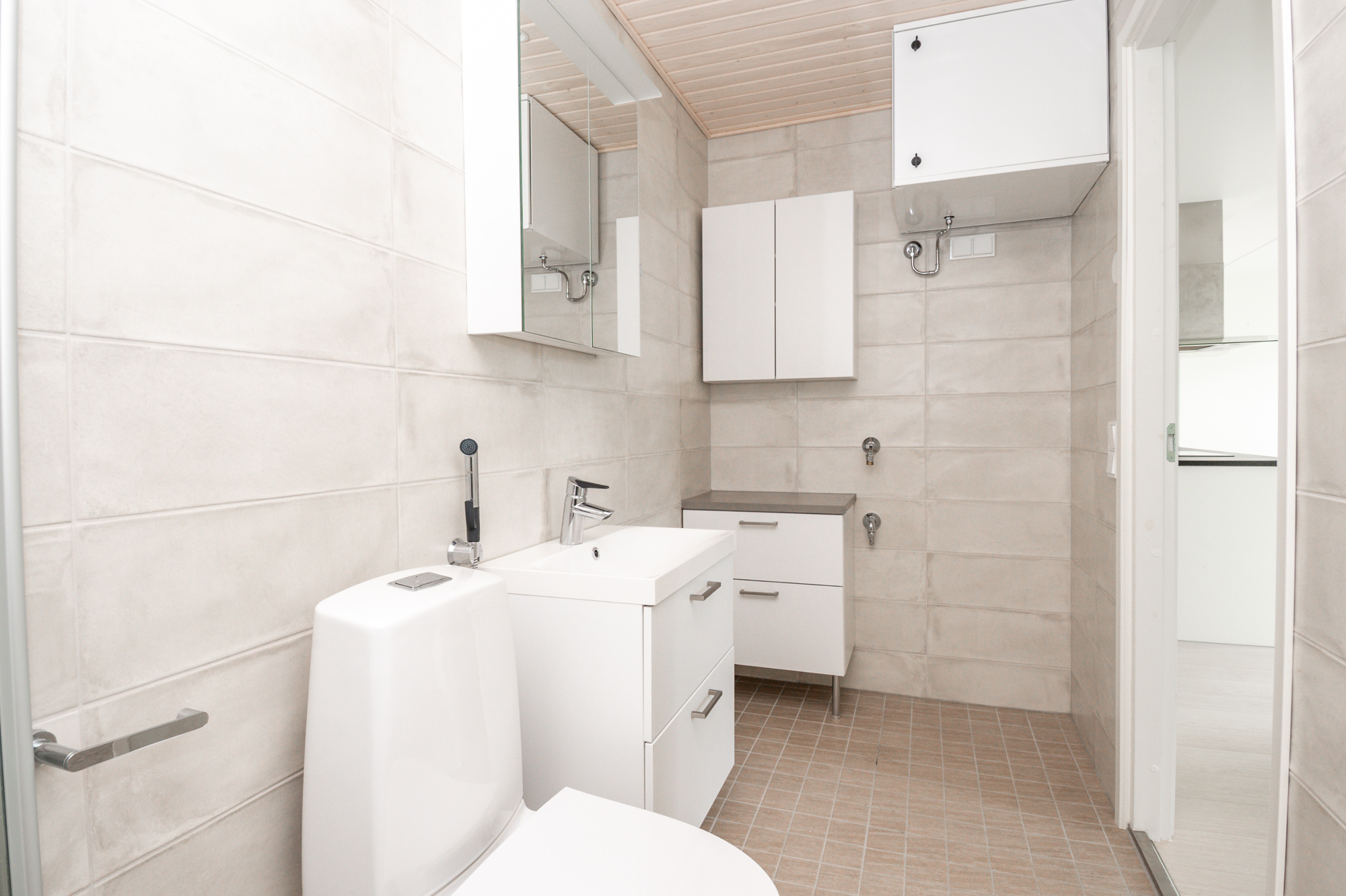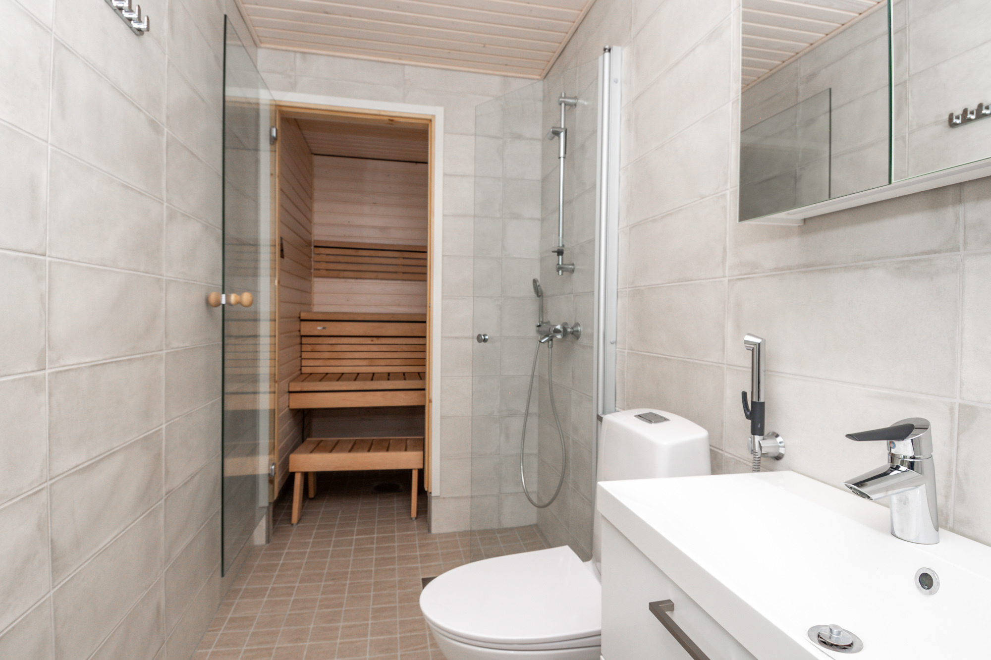 Tilava kylpyhuone oman saunan yhteydessä. Tilaa pesutornille.