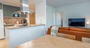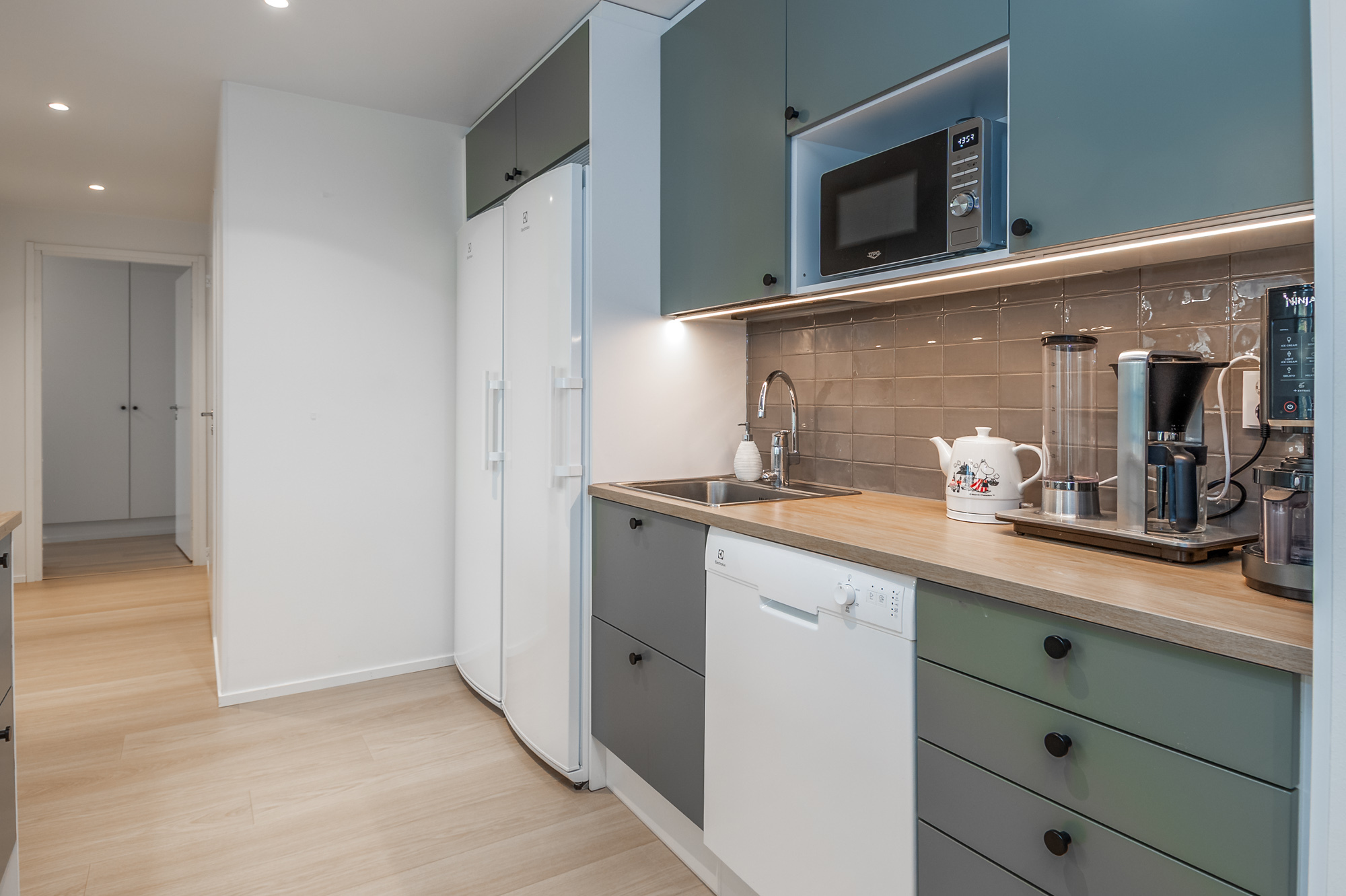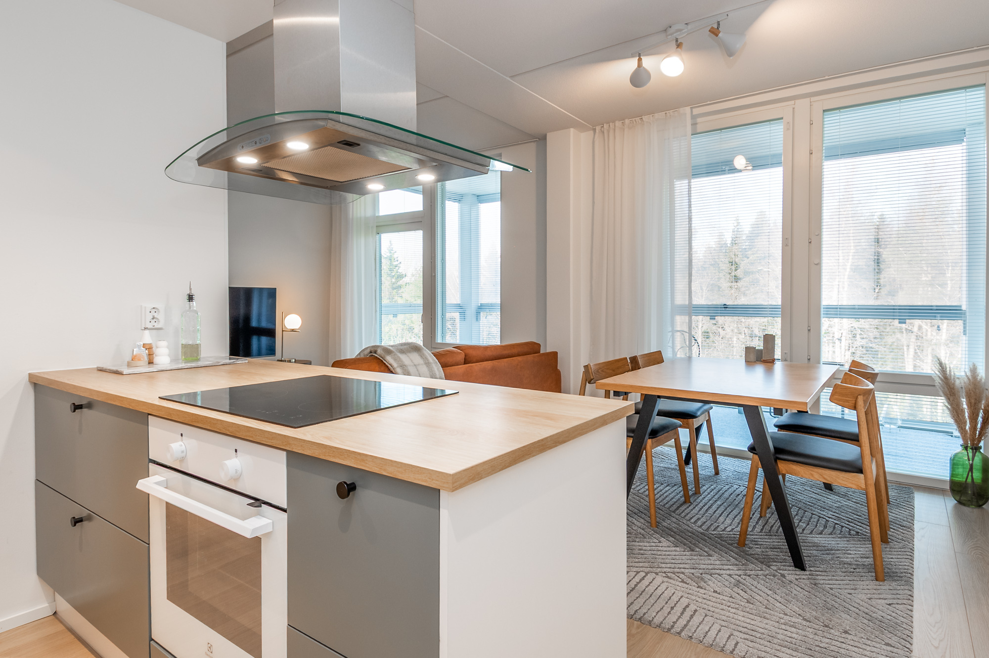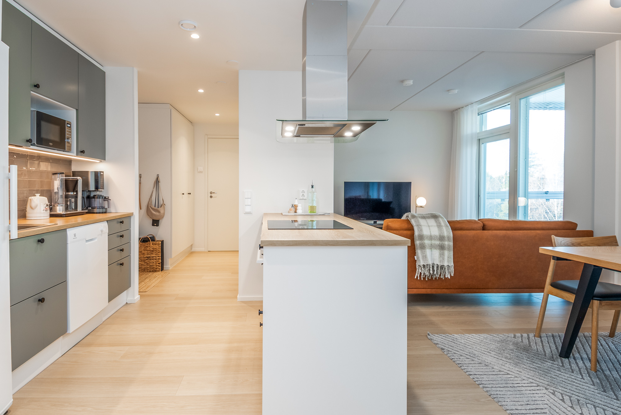 Keittiö ja olohuone yhtä tilaa. Korkeat jääkaappi ja pakastinkaappi, induktioliesi, liesituuletin, kalusteuuni, astianpesukone.