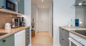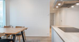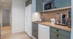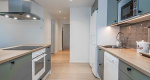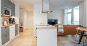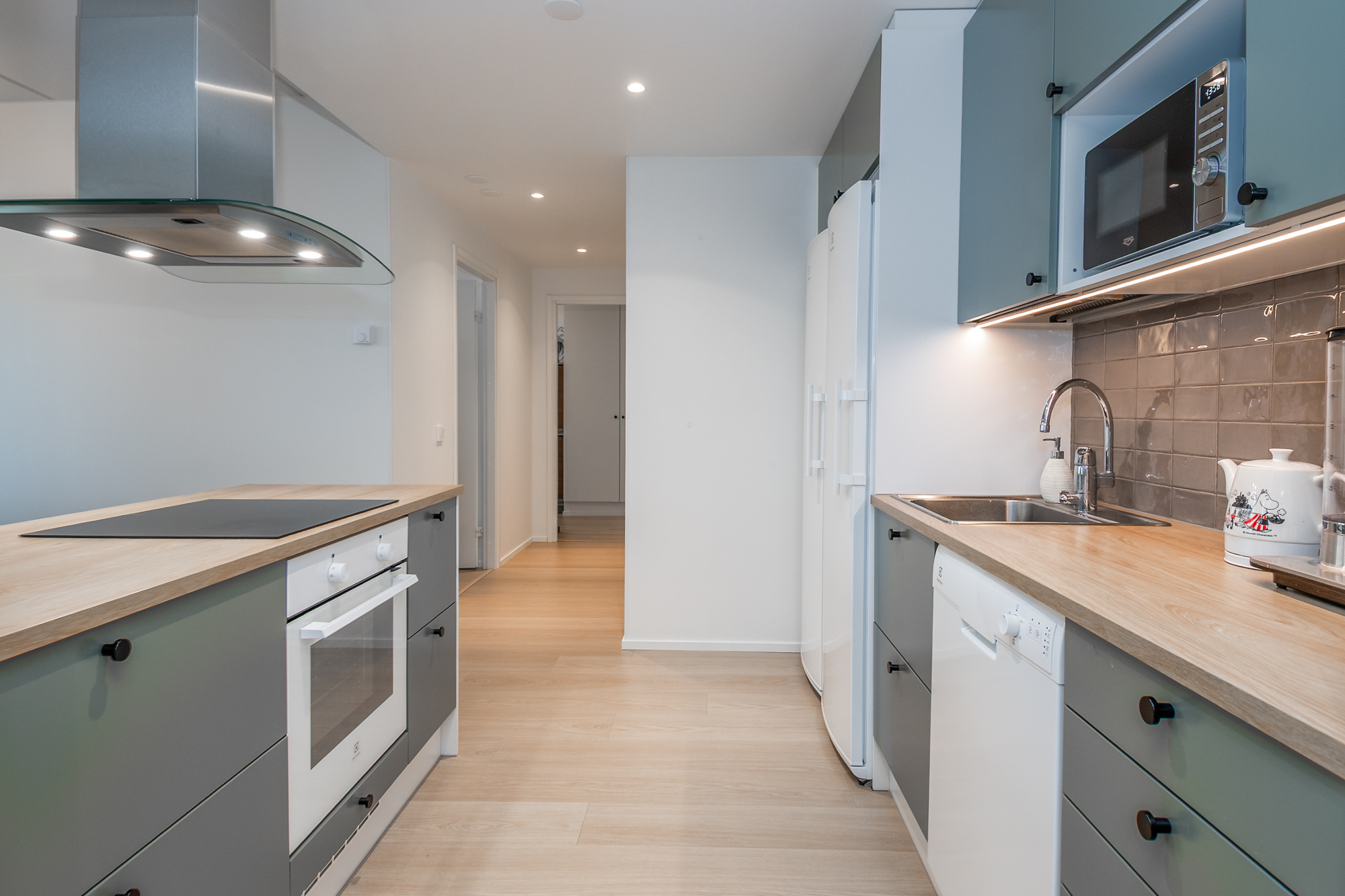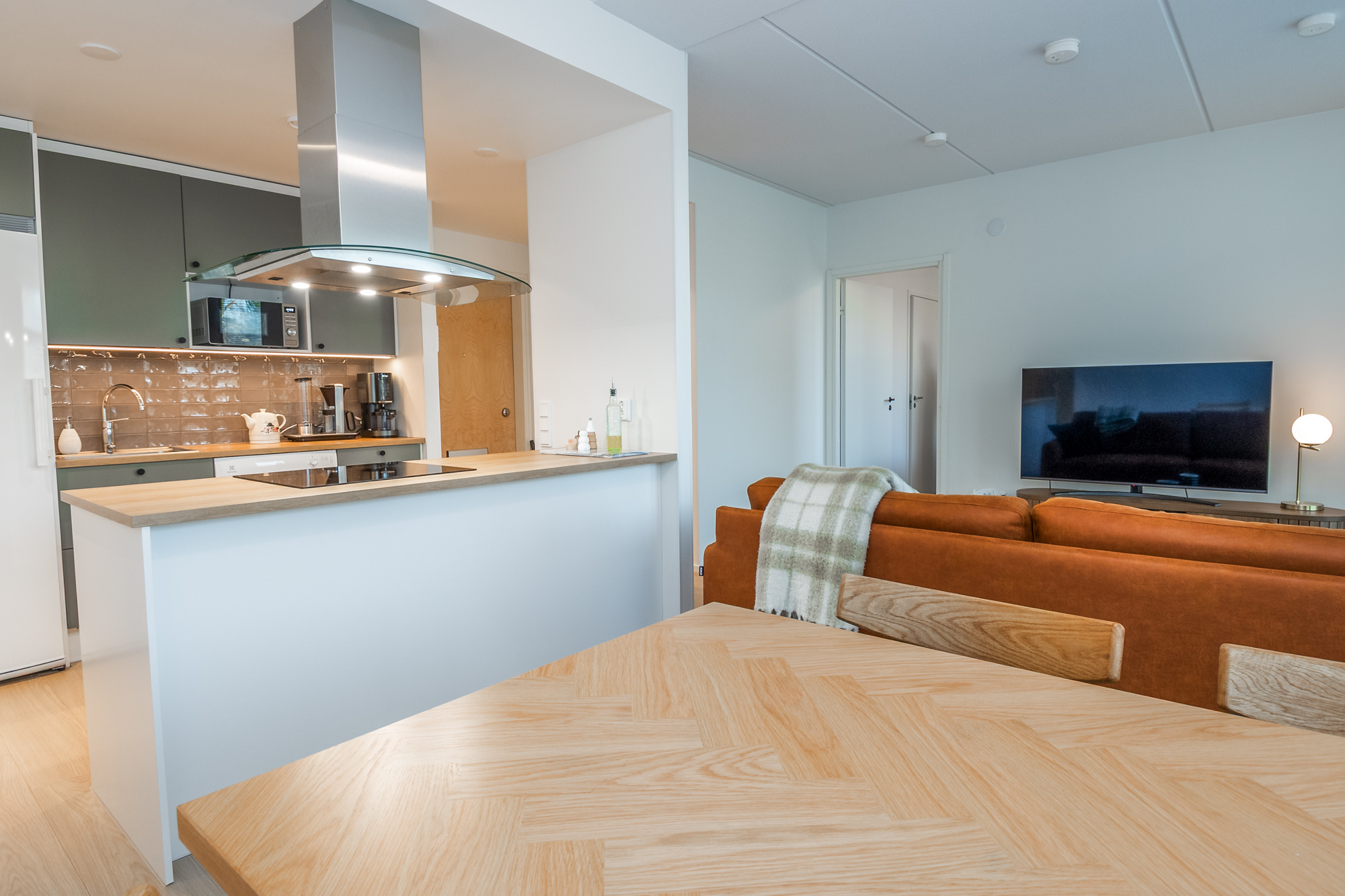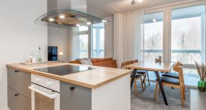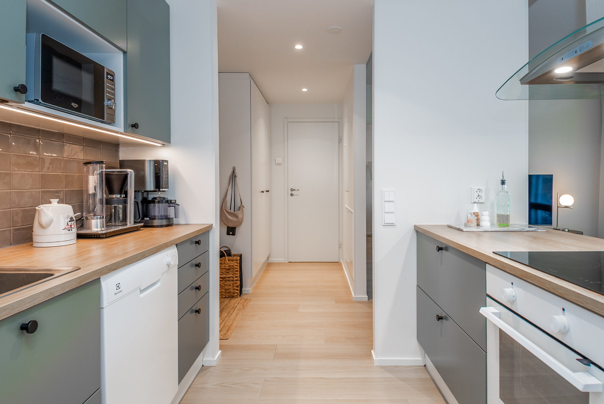 Keittiö ja olohuone yhtä tilaa. Korkeat jääkaappi ja pakastinkaappi, induktioliesi, liesituuletin, kalusteuuni, astianpesukone.