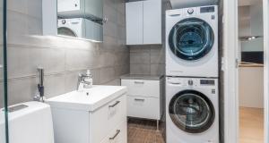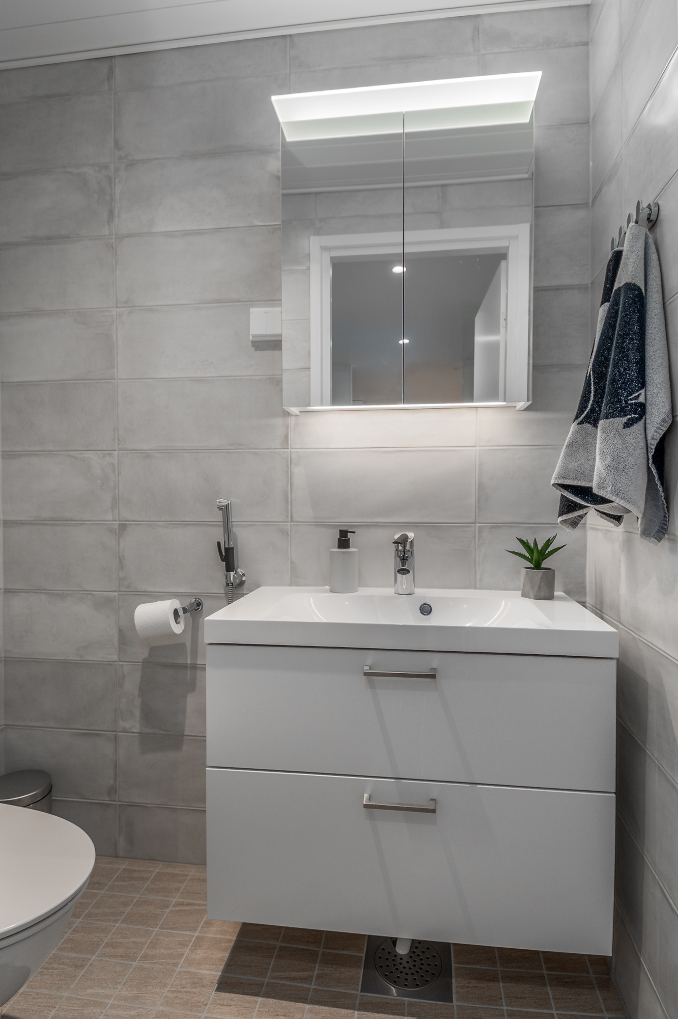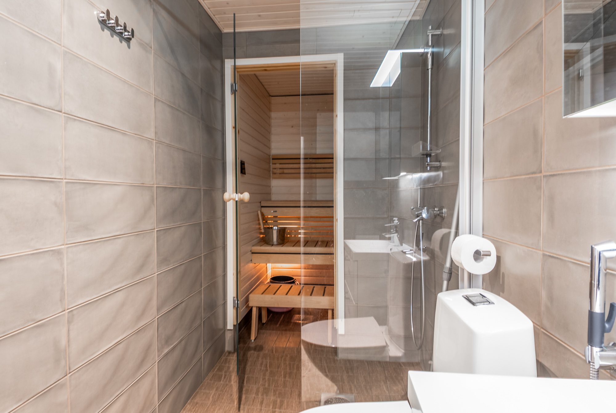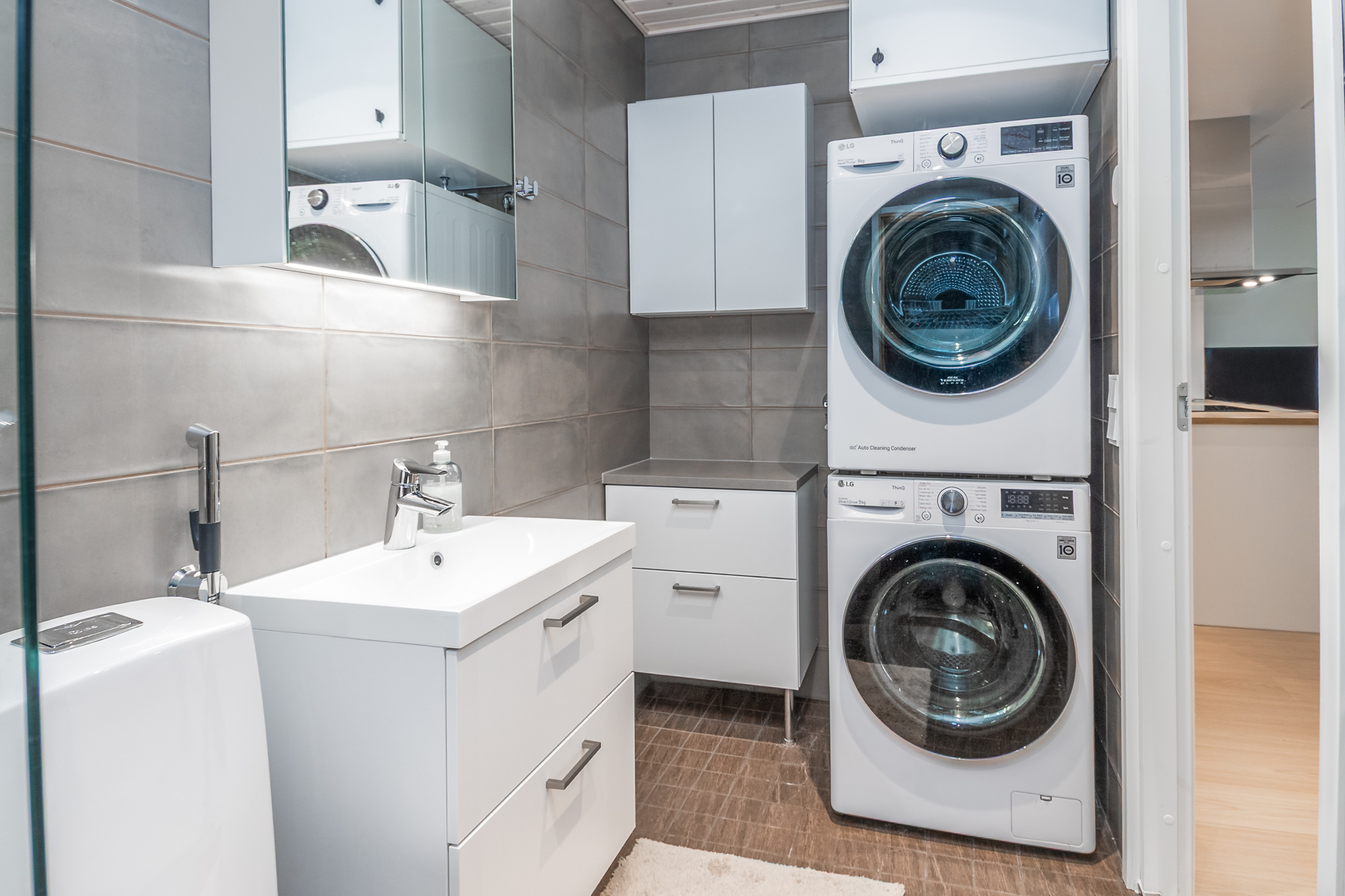 Tilava kylpyhuone oman saunan yhteydessä. Tilaa pesutornille.