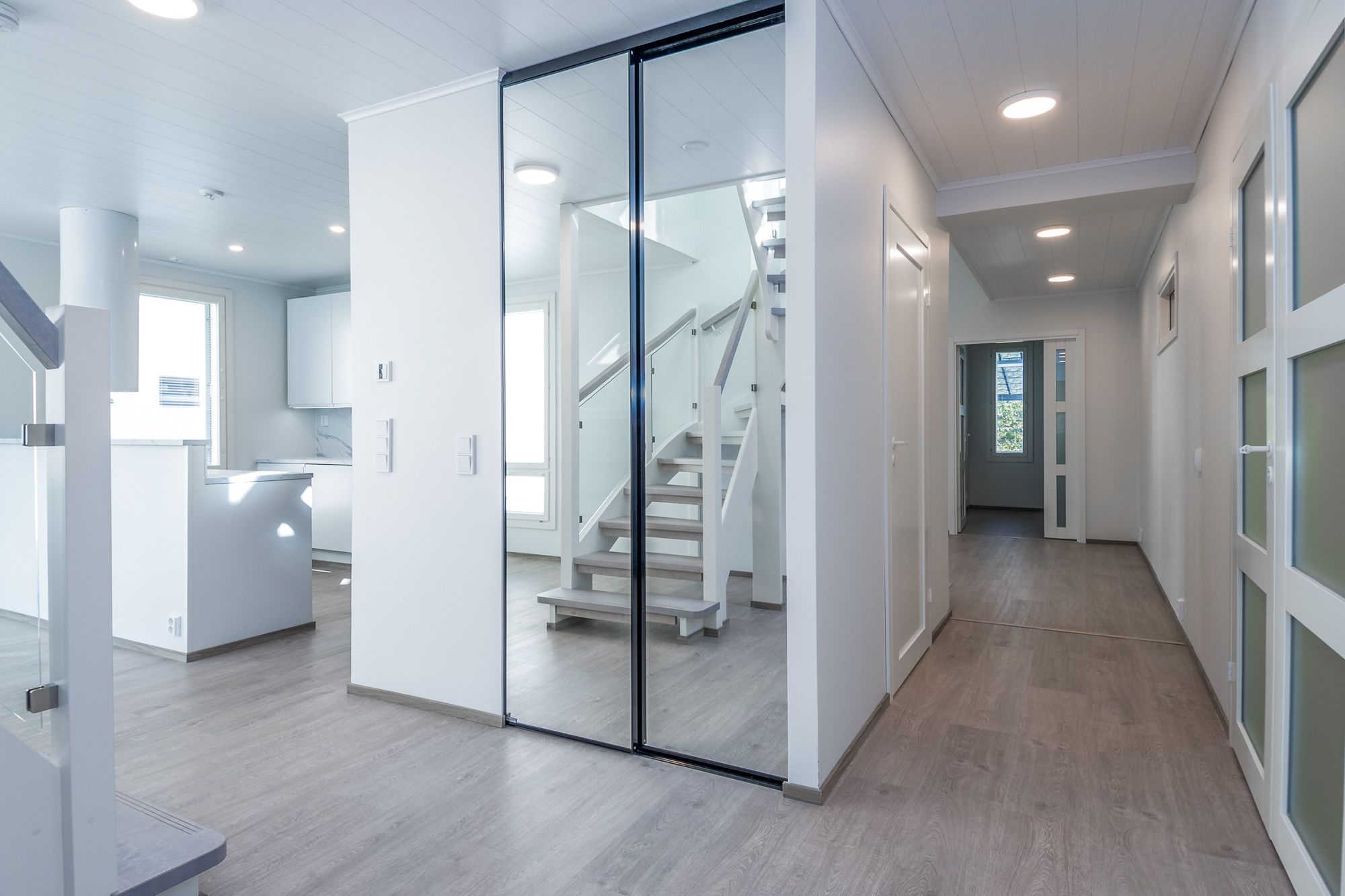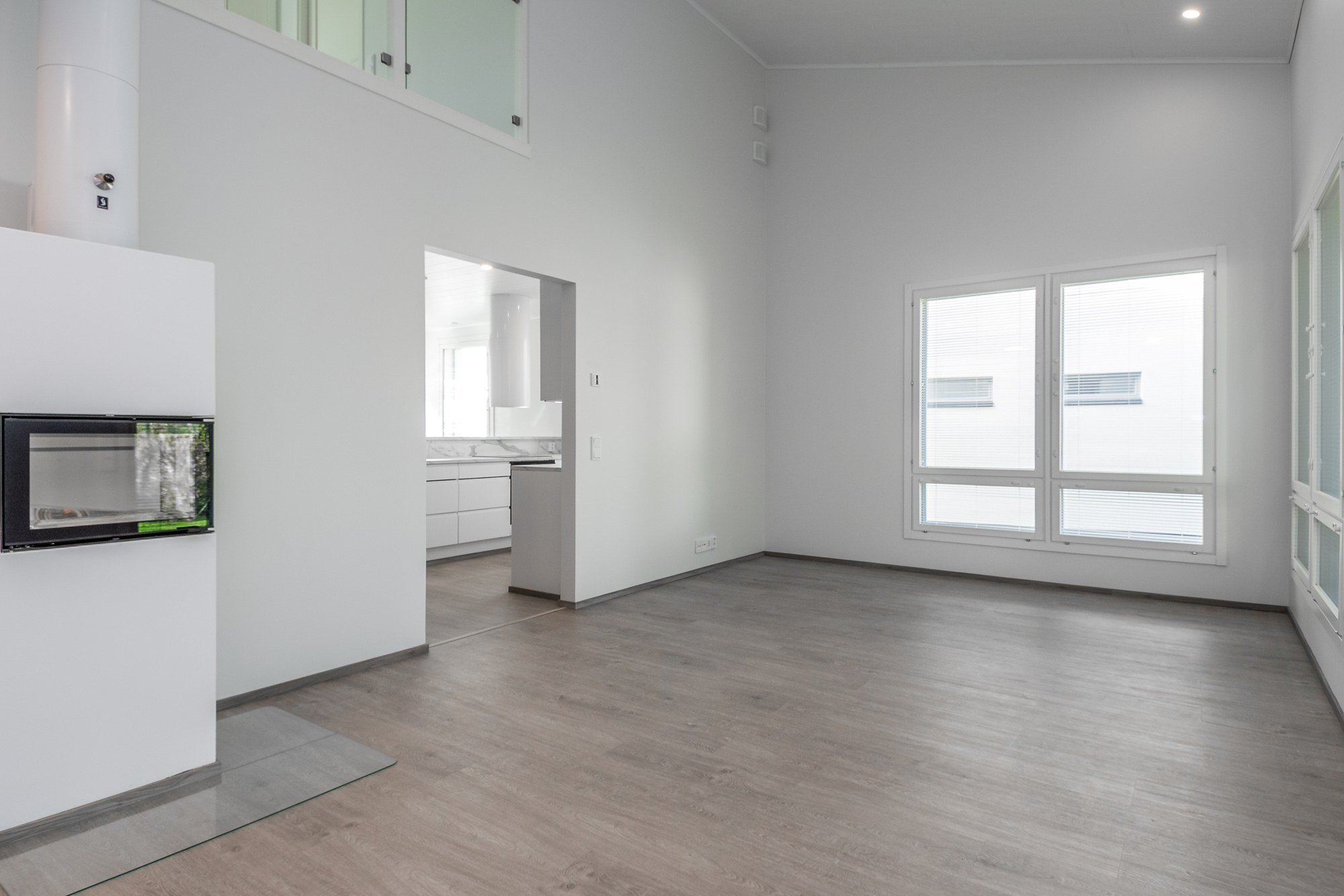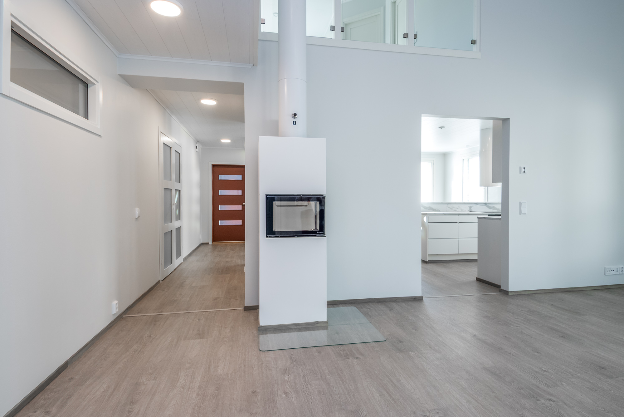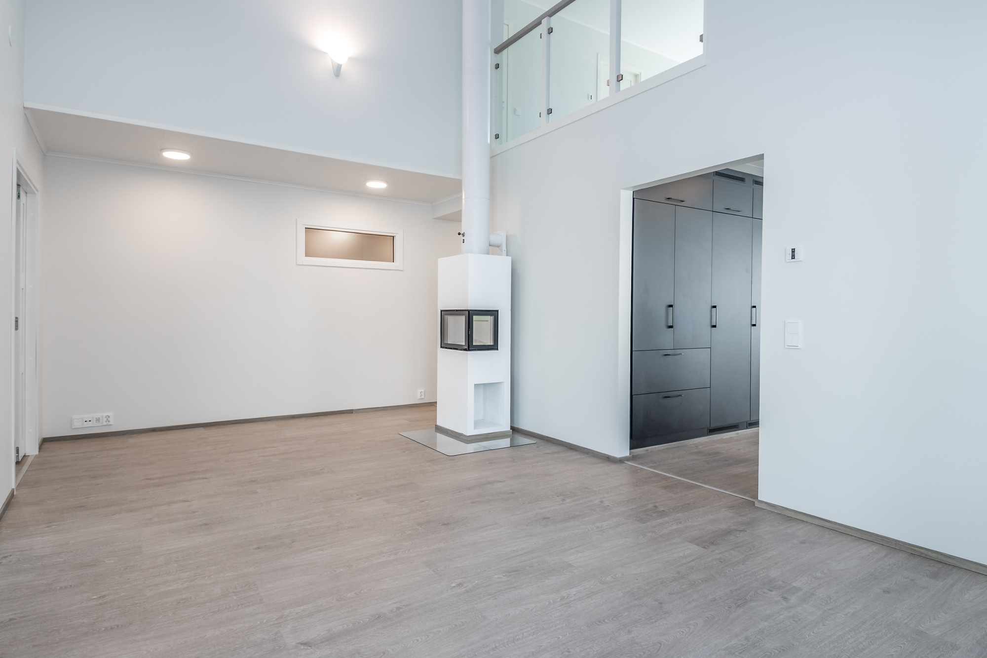 Alakerrassa avara eteisaula, moderni keittiö ruokailutilan yhteydessä, kahden kerroksen korkuinen olohuone, missä on kiertoilmatakka ja kulku terassille. Yksi neljästä makuuhuoneesta alakerrassa, kolme yläkerrasa.