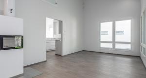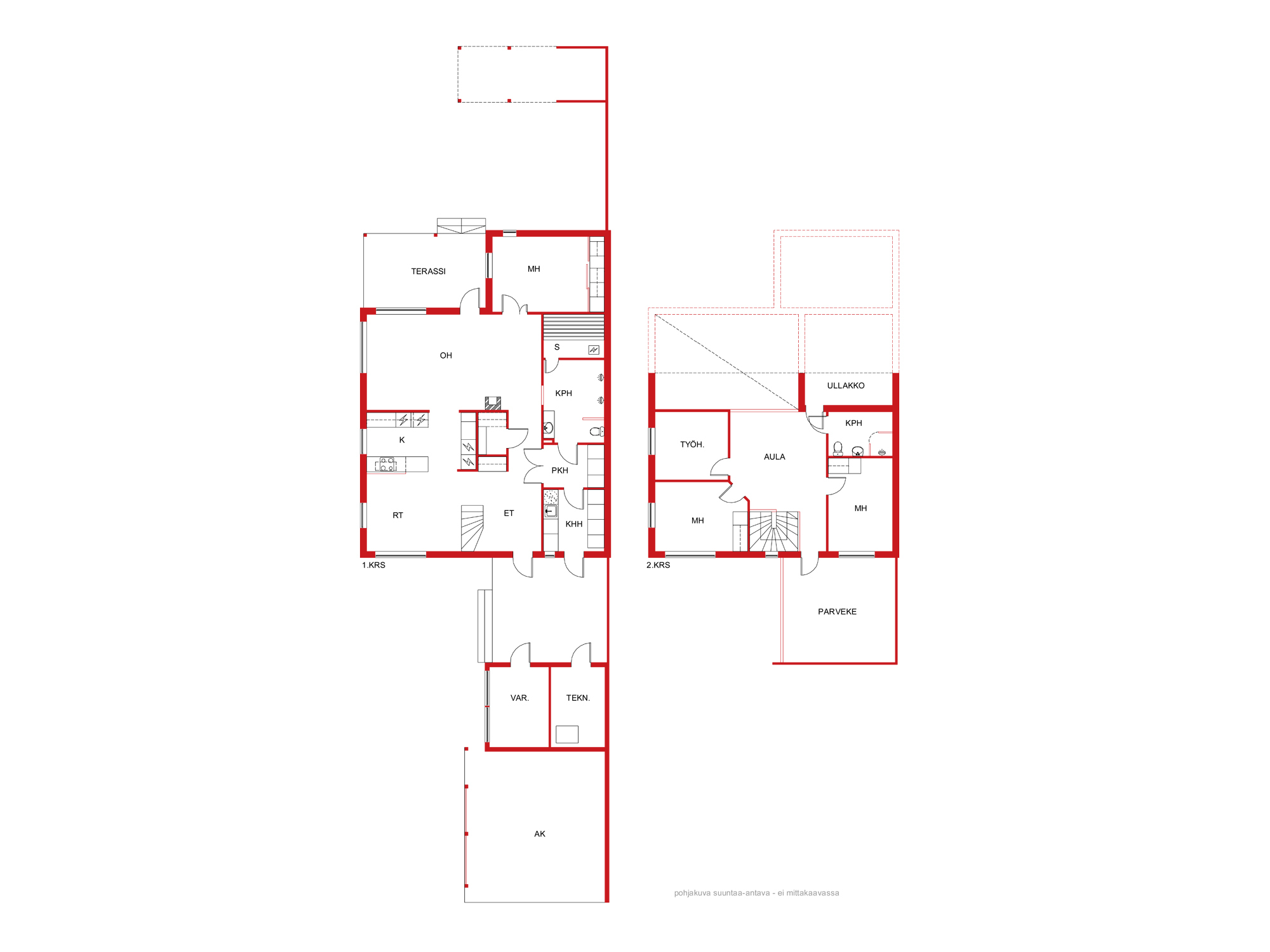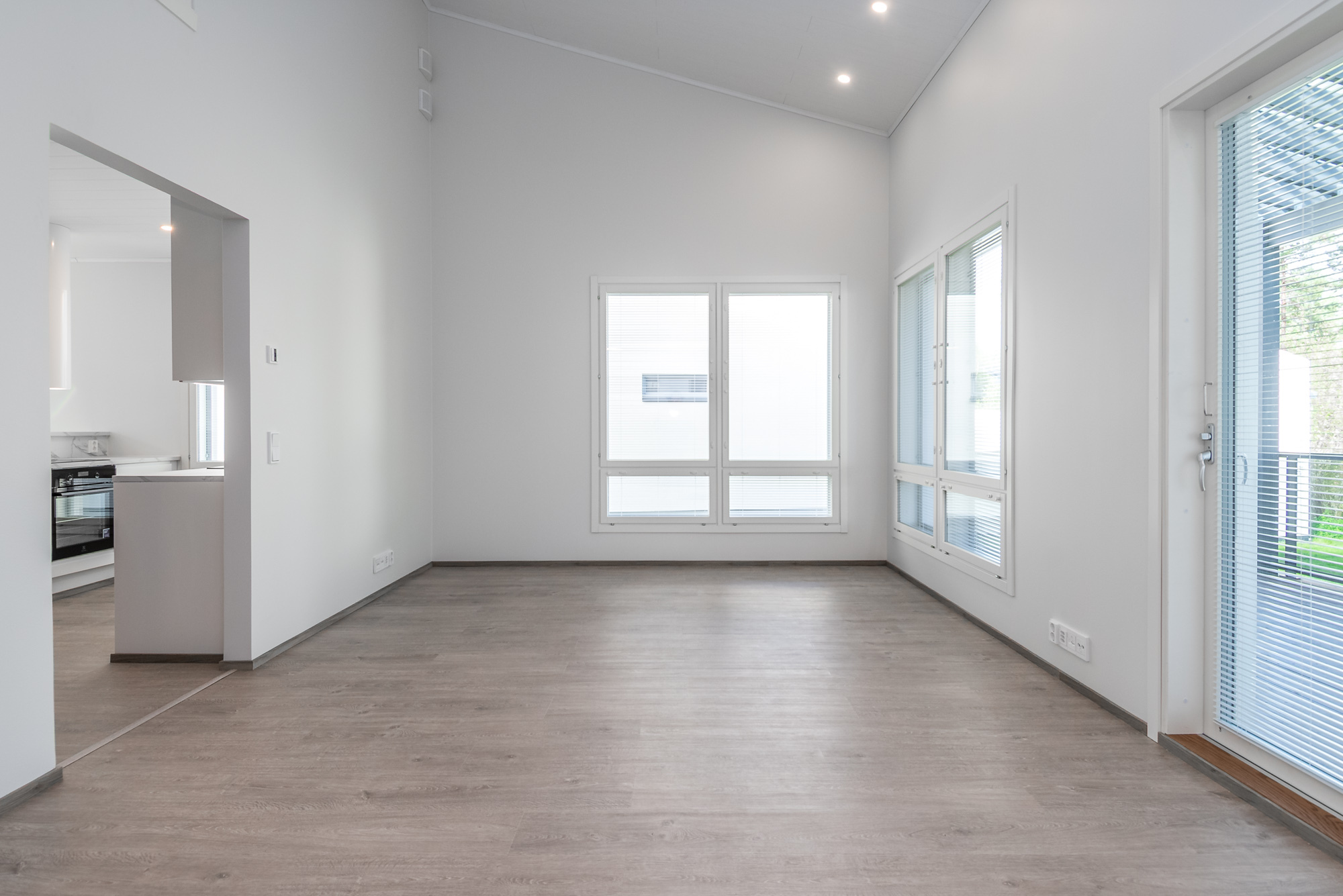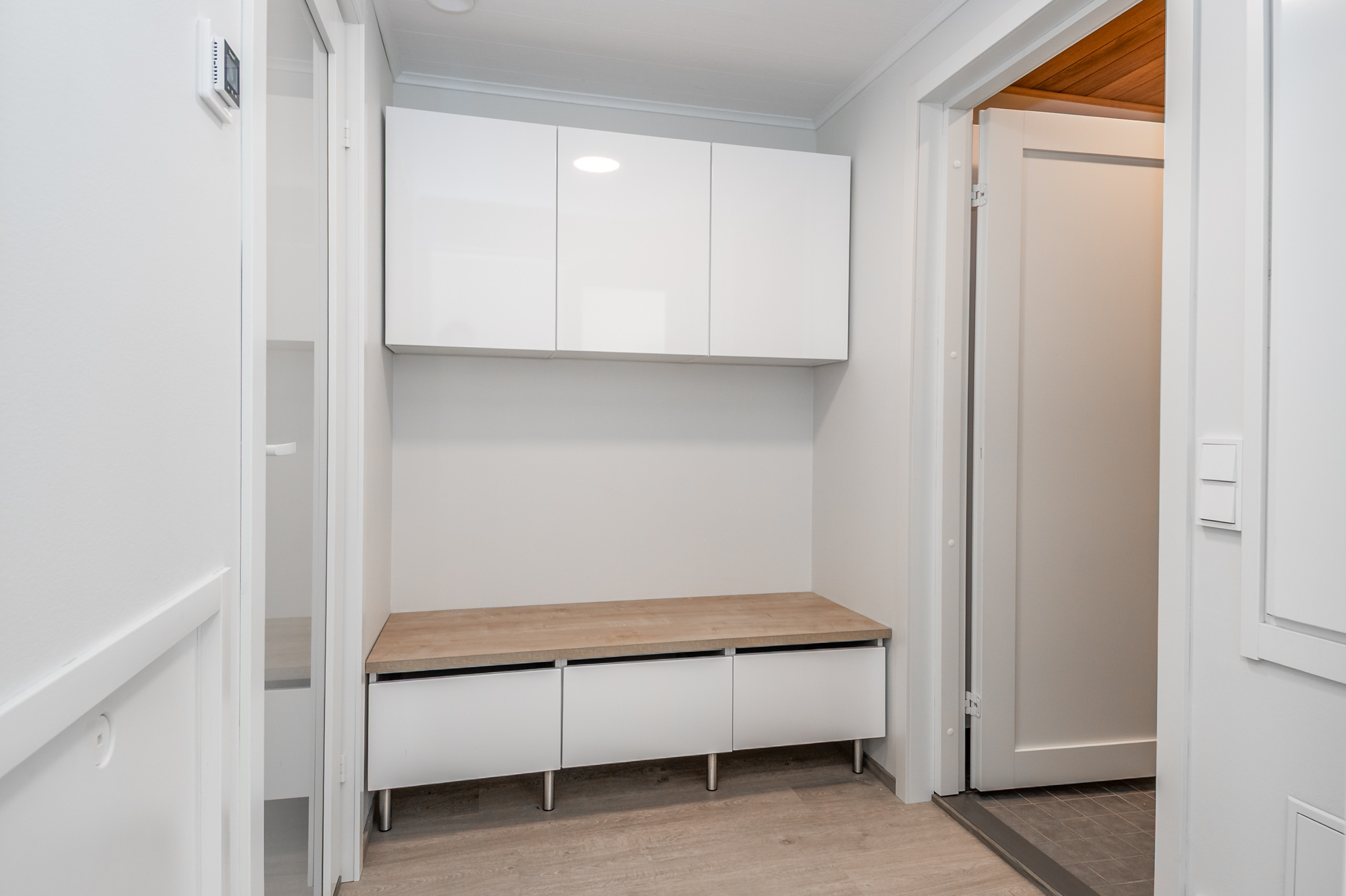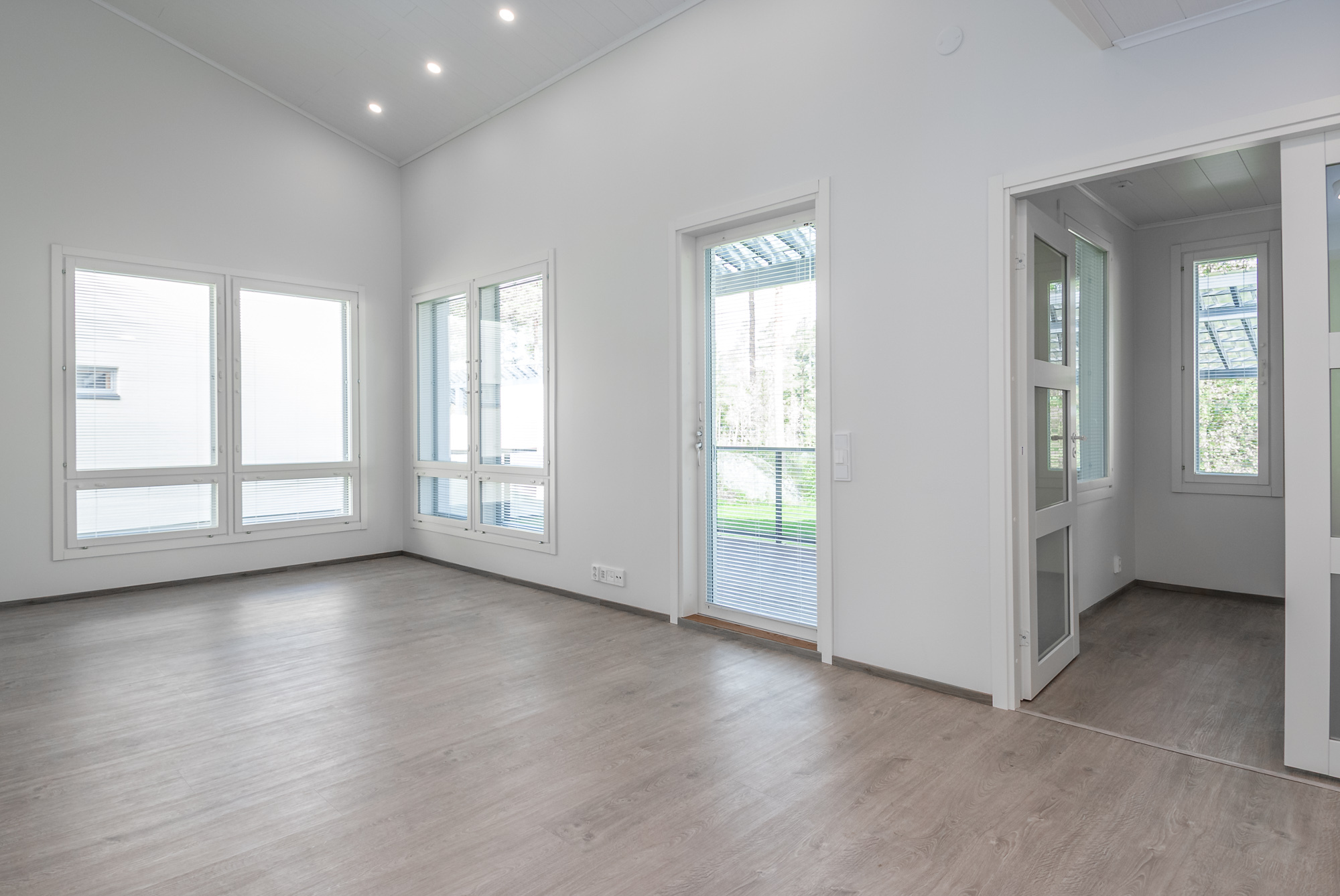 Alakerrassa avara eteisaula, moderni keittiö ruokailutilan yhteydessä, kahden kerroksen korkuinen olohuone, missä on kiertoilmatakka ja kulku terassille. Yksi neljästä makuuhuoneesta alakerrassa, kolme yläkerrasa.