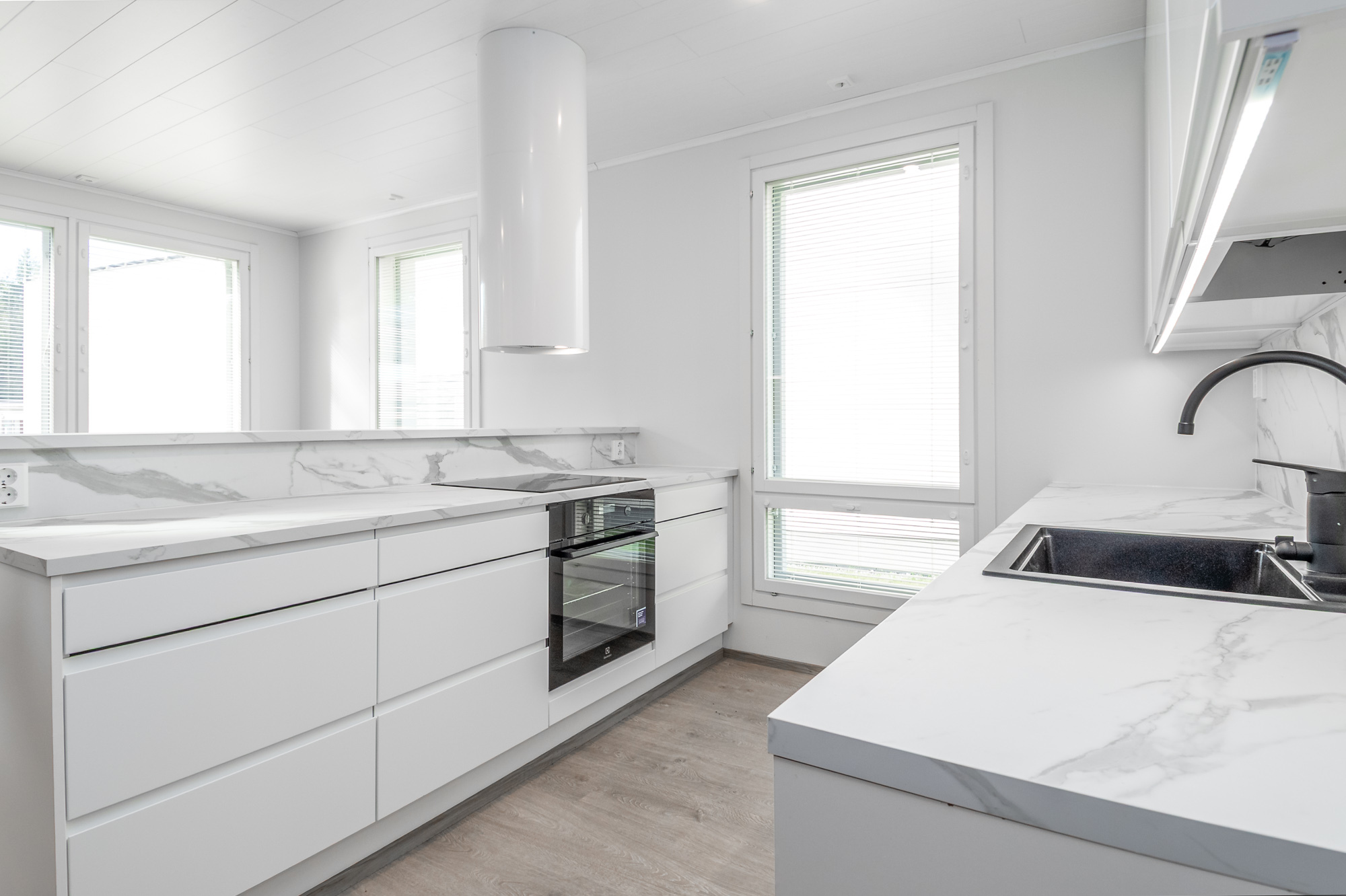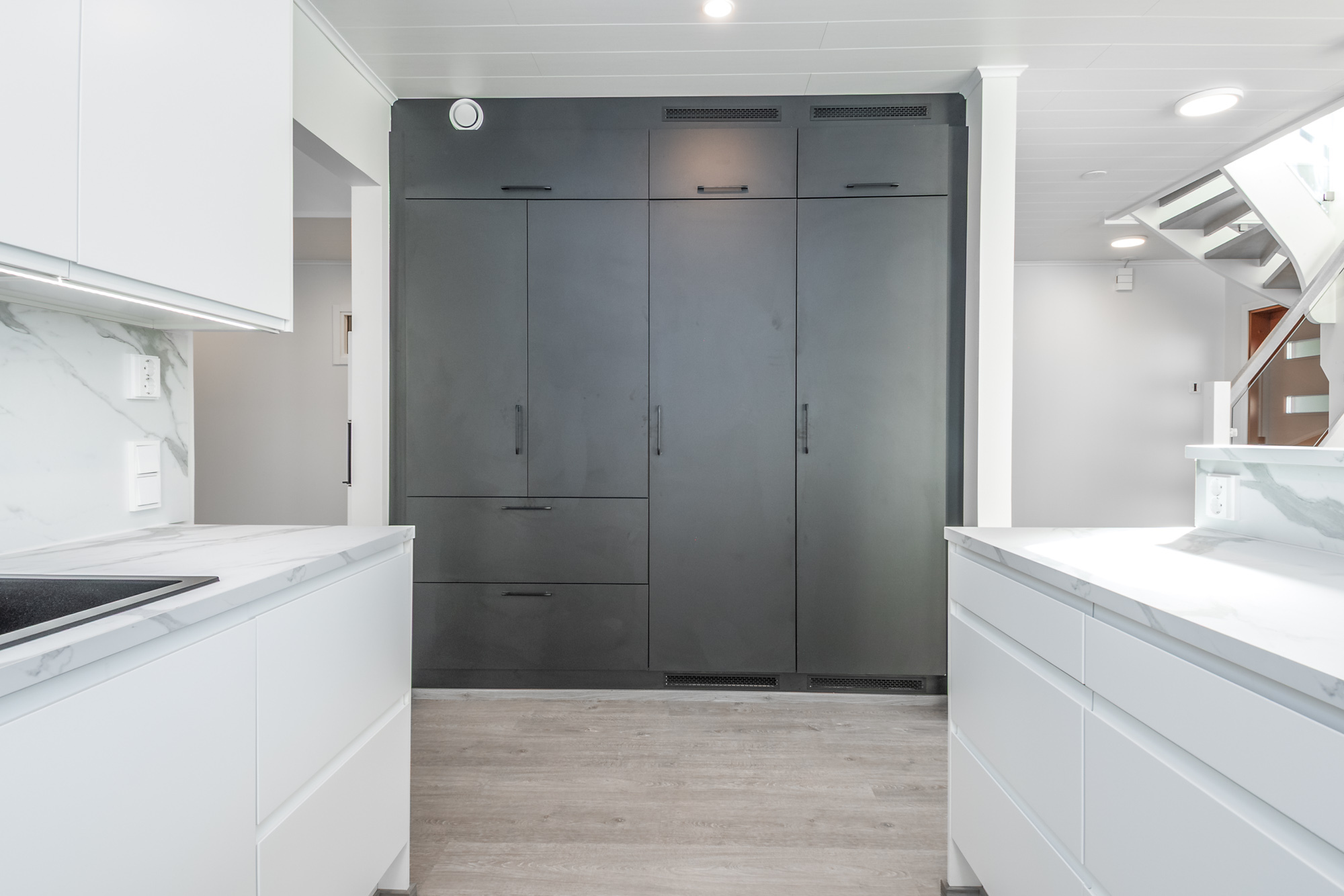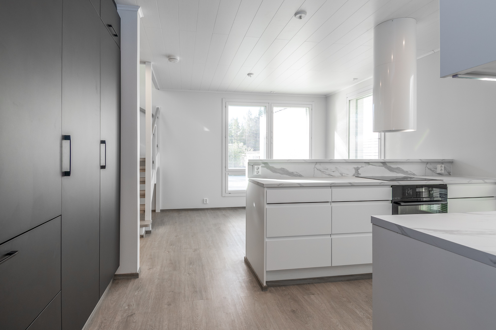 Keittiö yhdistyy yhdistyy ruokailutilaan muodostaen avaran kokonaisuuden. Kodinkoneet integroitu. Korkeat jääkaappi ja pakastinkaappi. Uuni, induktioliesi, liesituuletin. Asianpesukone.