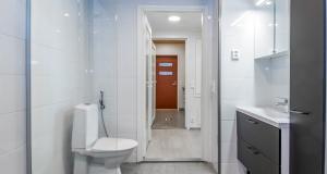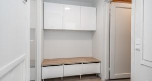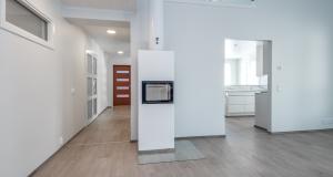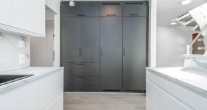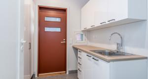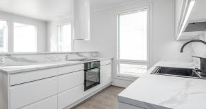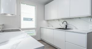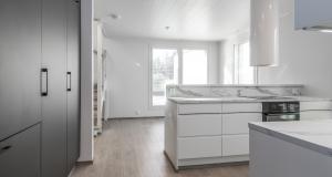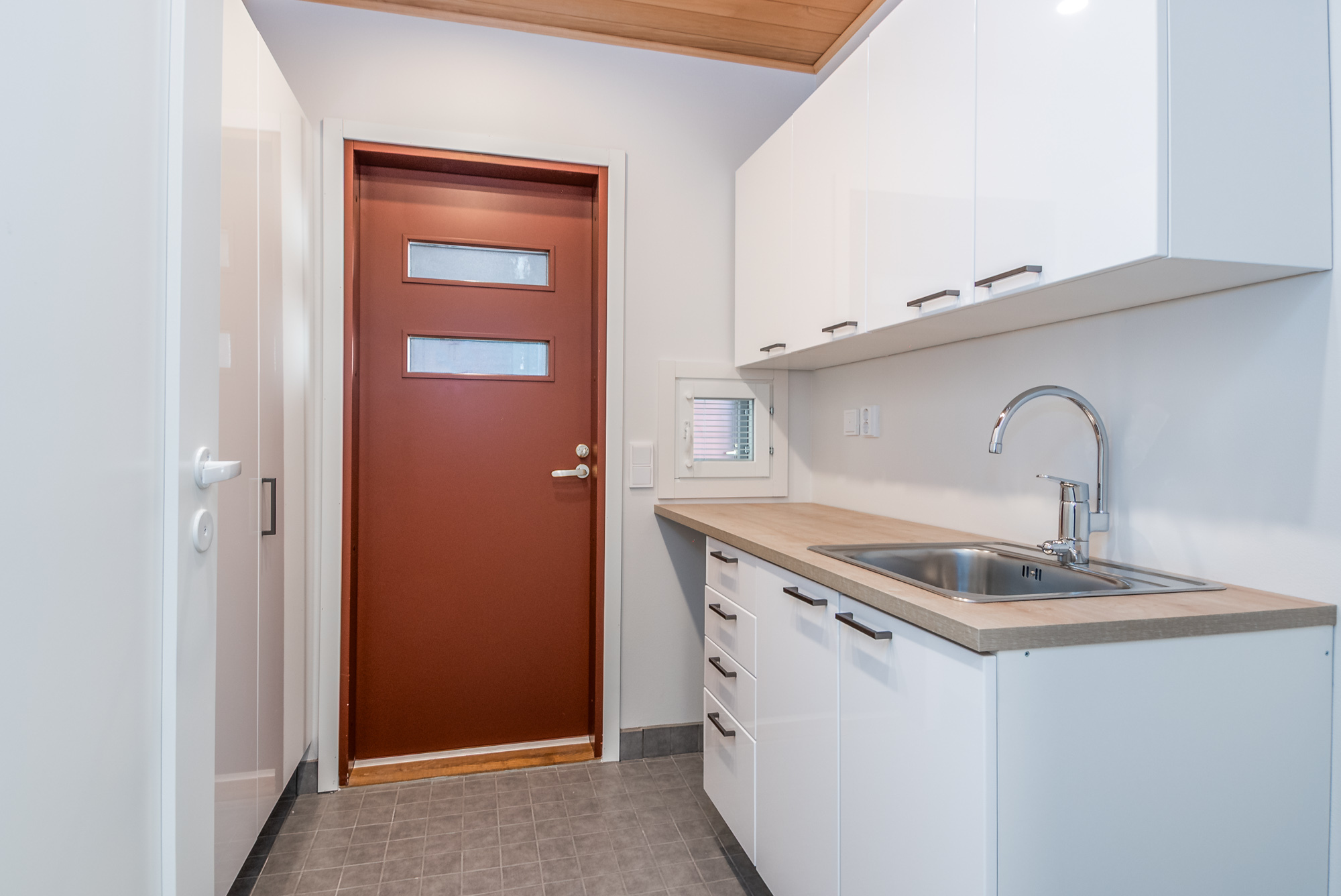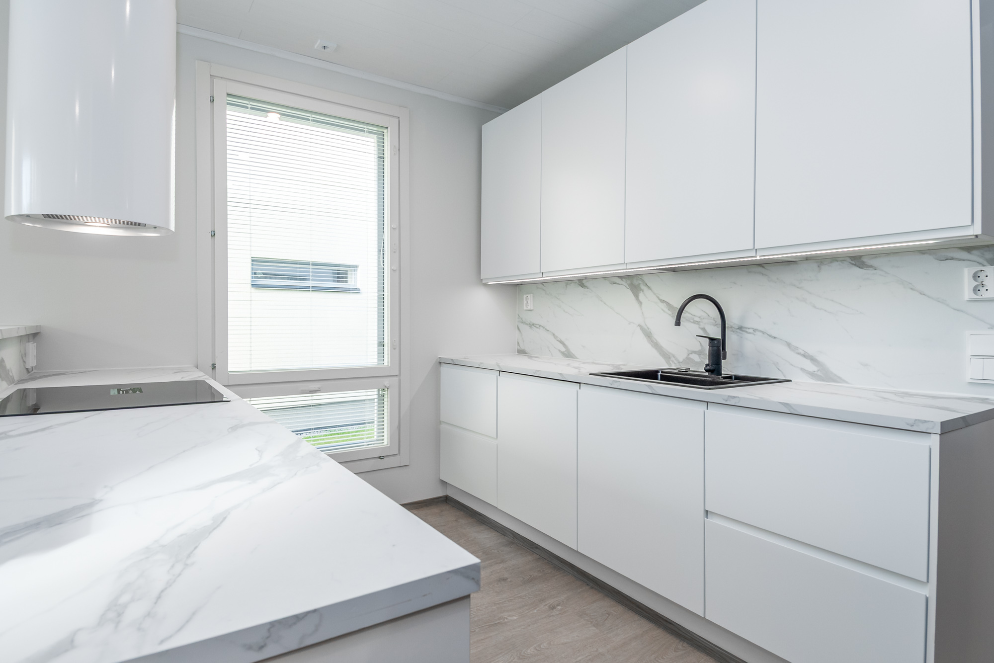 Keittiö yhdistyy yhdistyy ruokailutilaan muodostaen avaran kokonaisuuden. Kodinkoneet integroitu. Korkeat jääkaappi ja pakastinkaappi. Uuni, induktioliesi, liesituuletin. Asianpesukone.