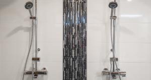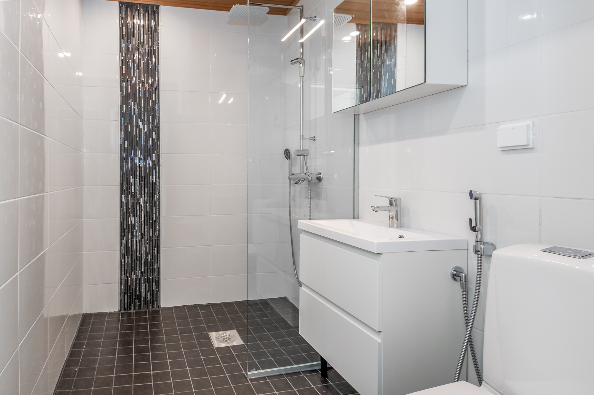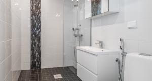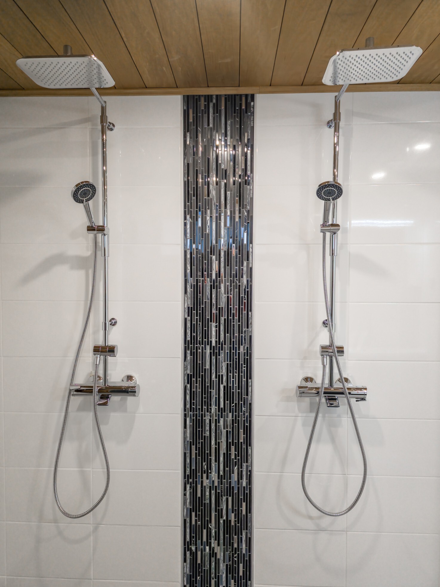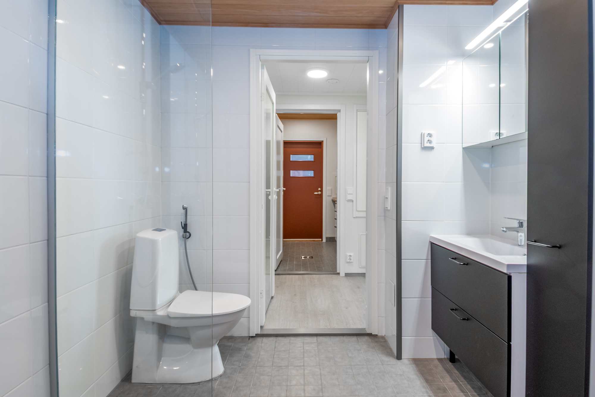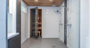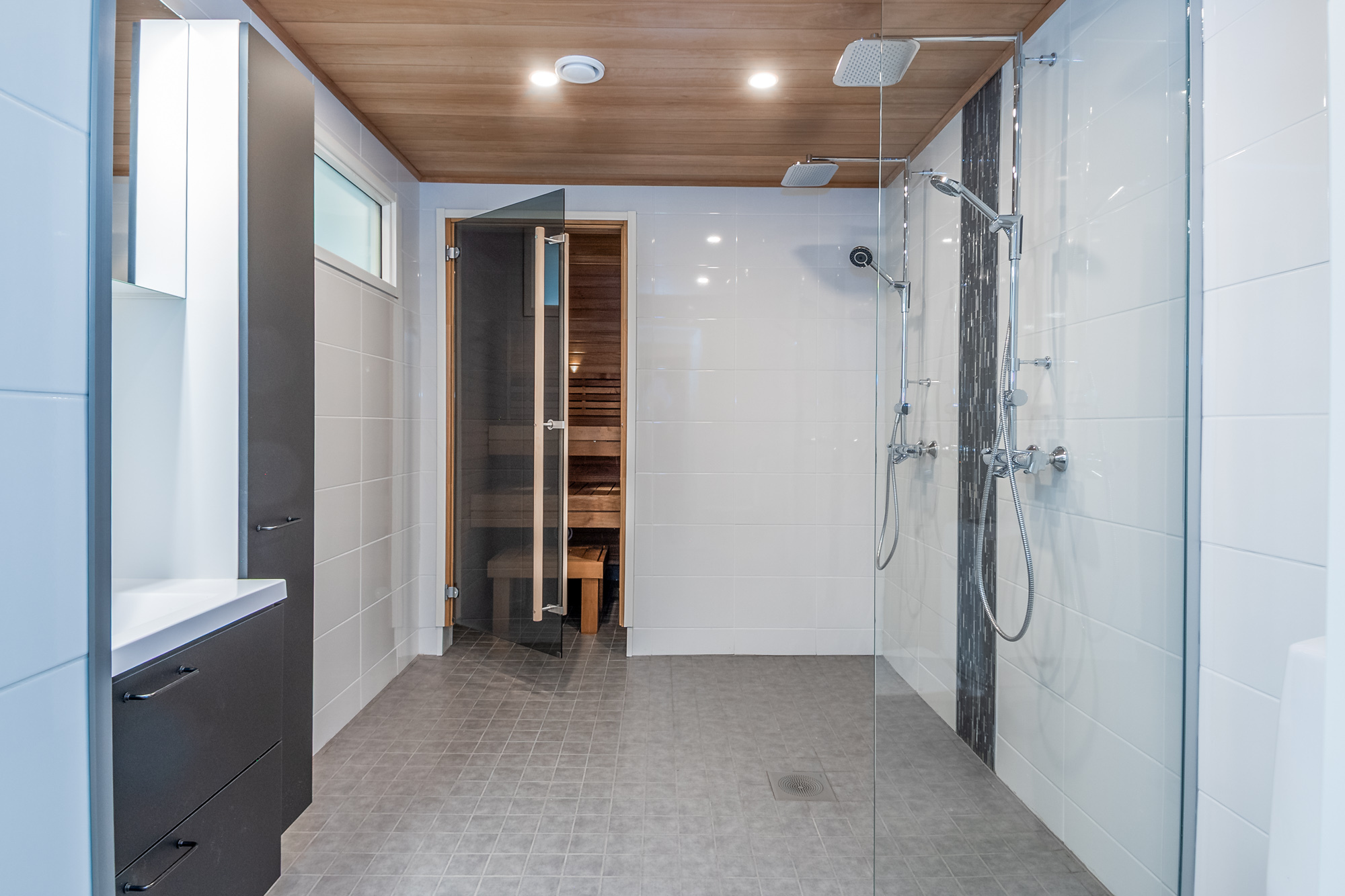 Alakerrassa saunatilat missä suihkutila kahdella suihkulla. Tilan yhteydessä erillinen pukuhuone. Myös yläkerrassa kylpyhuone, missä suihku.