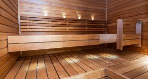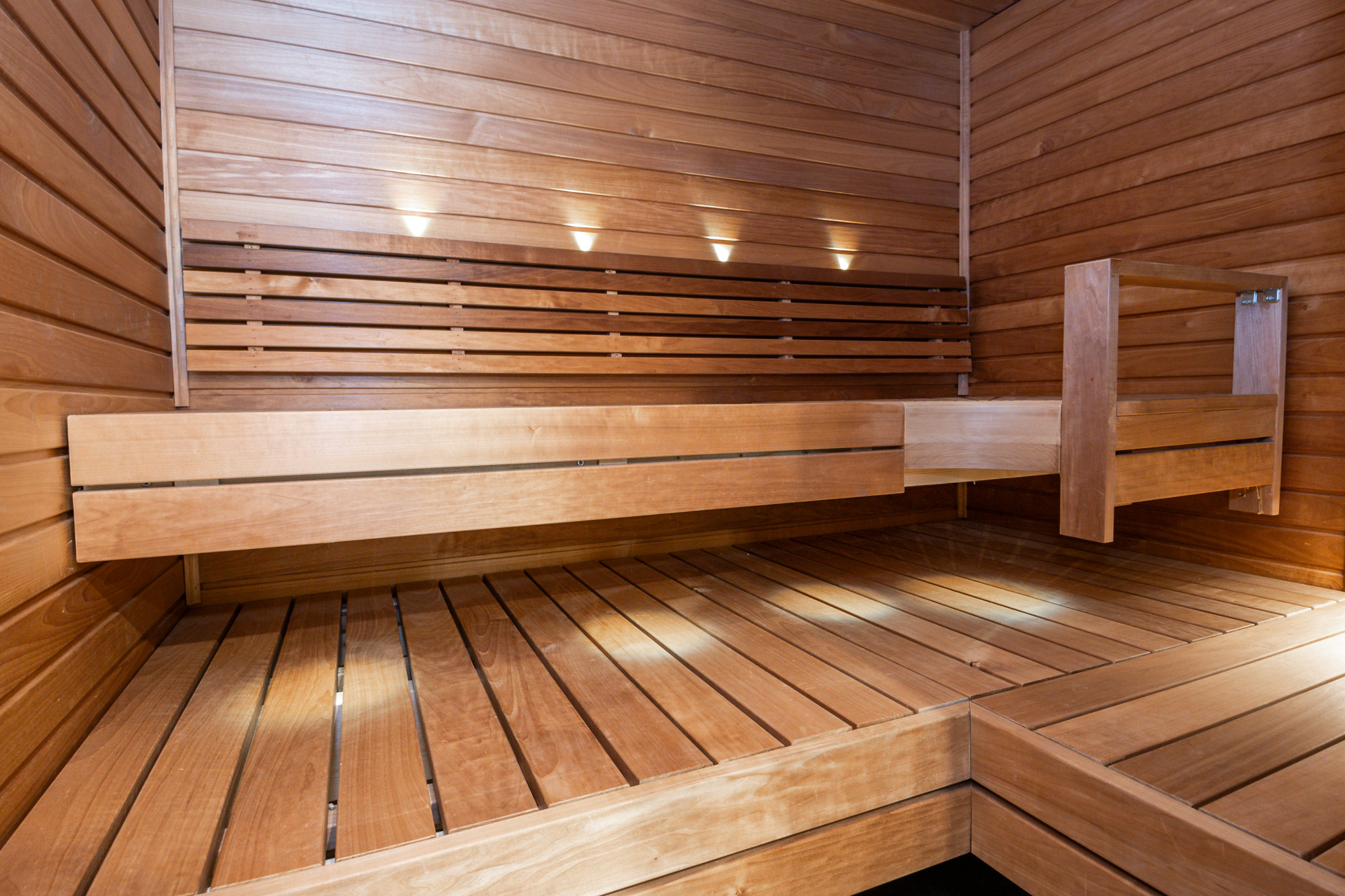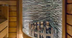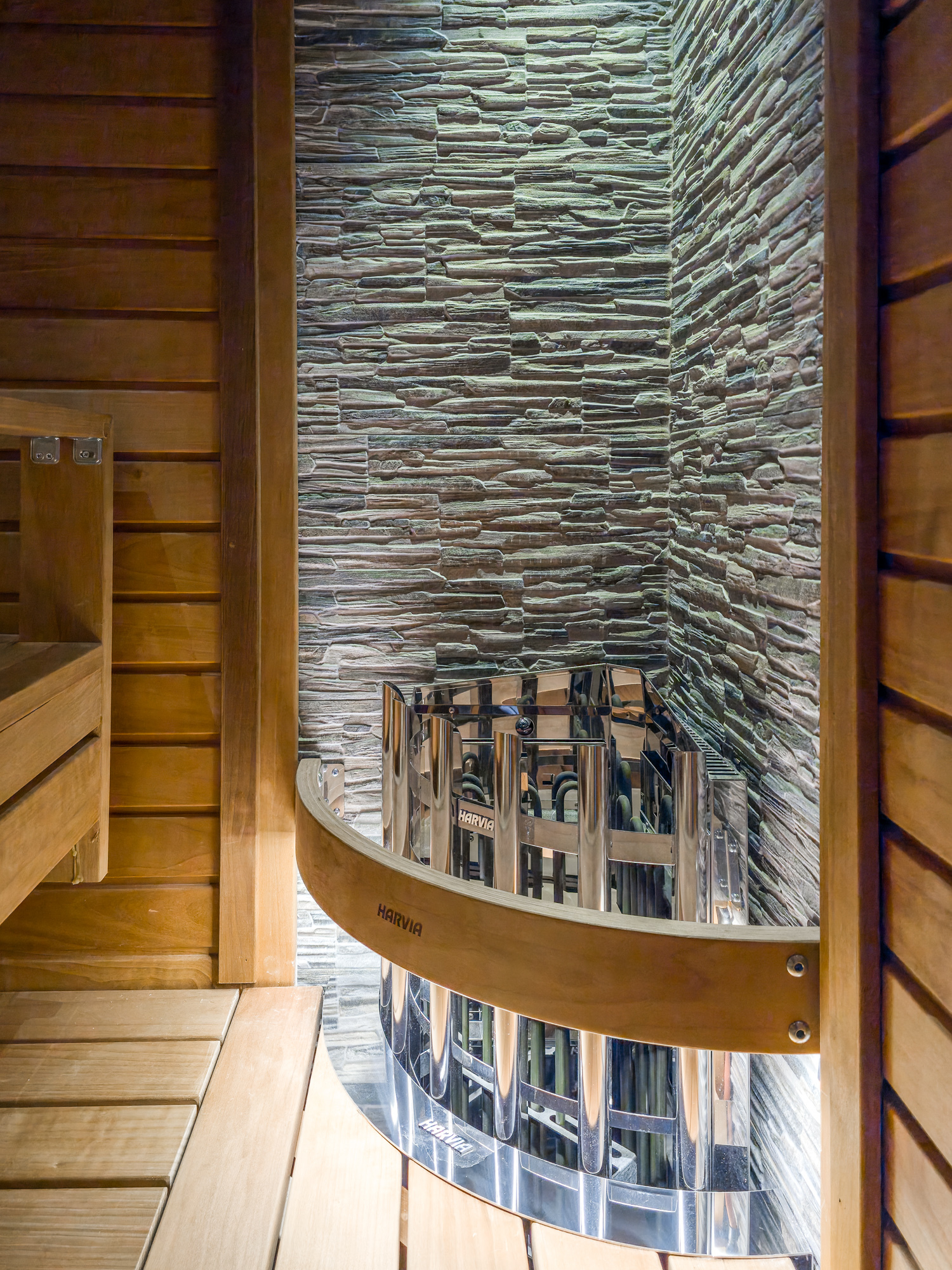 Lyxig bastuavdelning med omklädningsrum och dubbla duschar samt ett rymligt separat grovkök med egen utgång. På övre våningen finns även ett badrum med dusch.