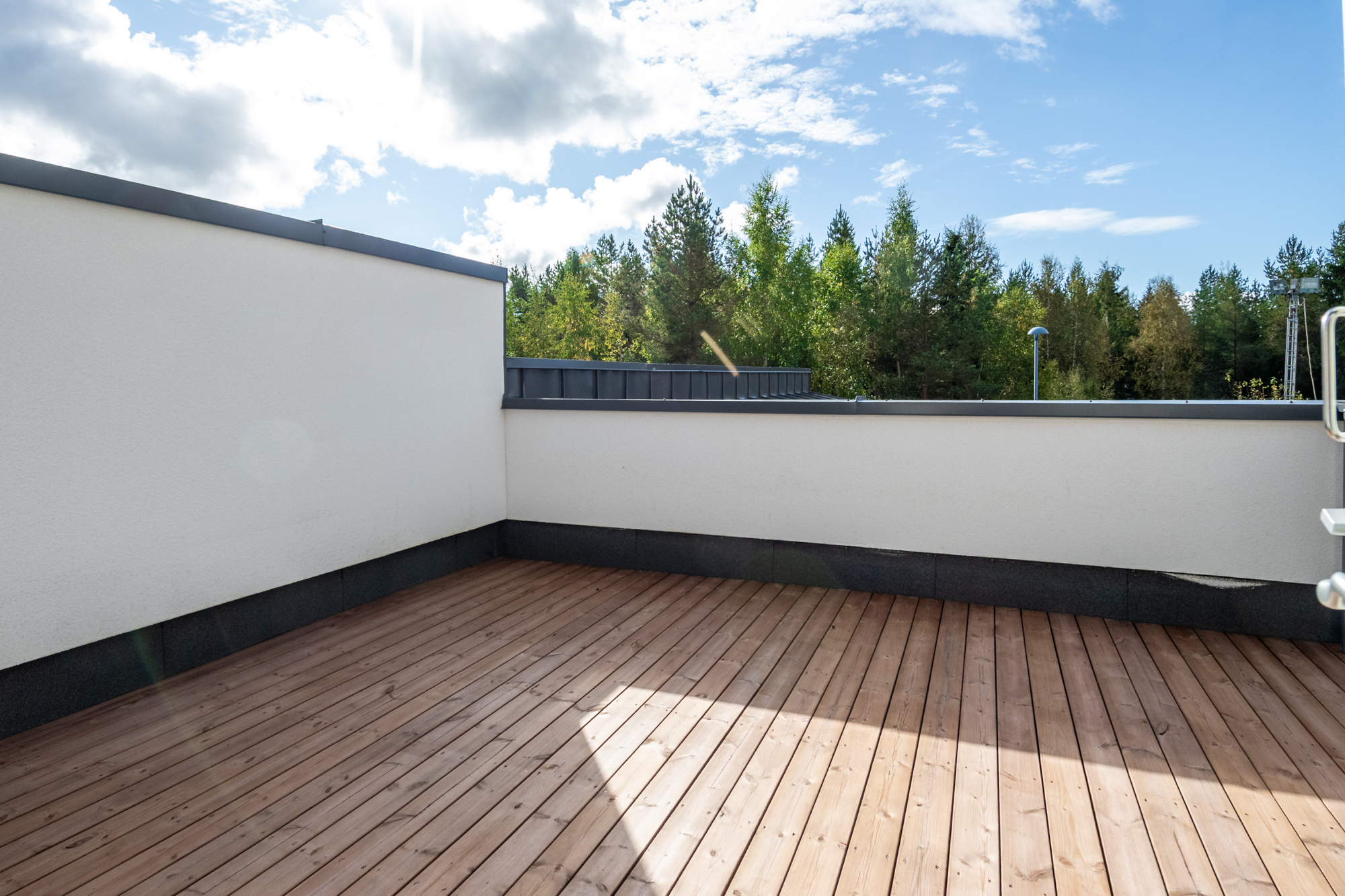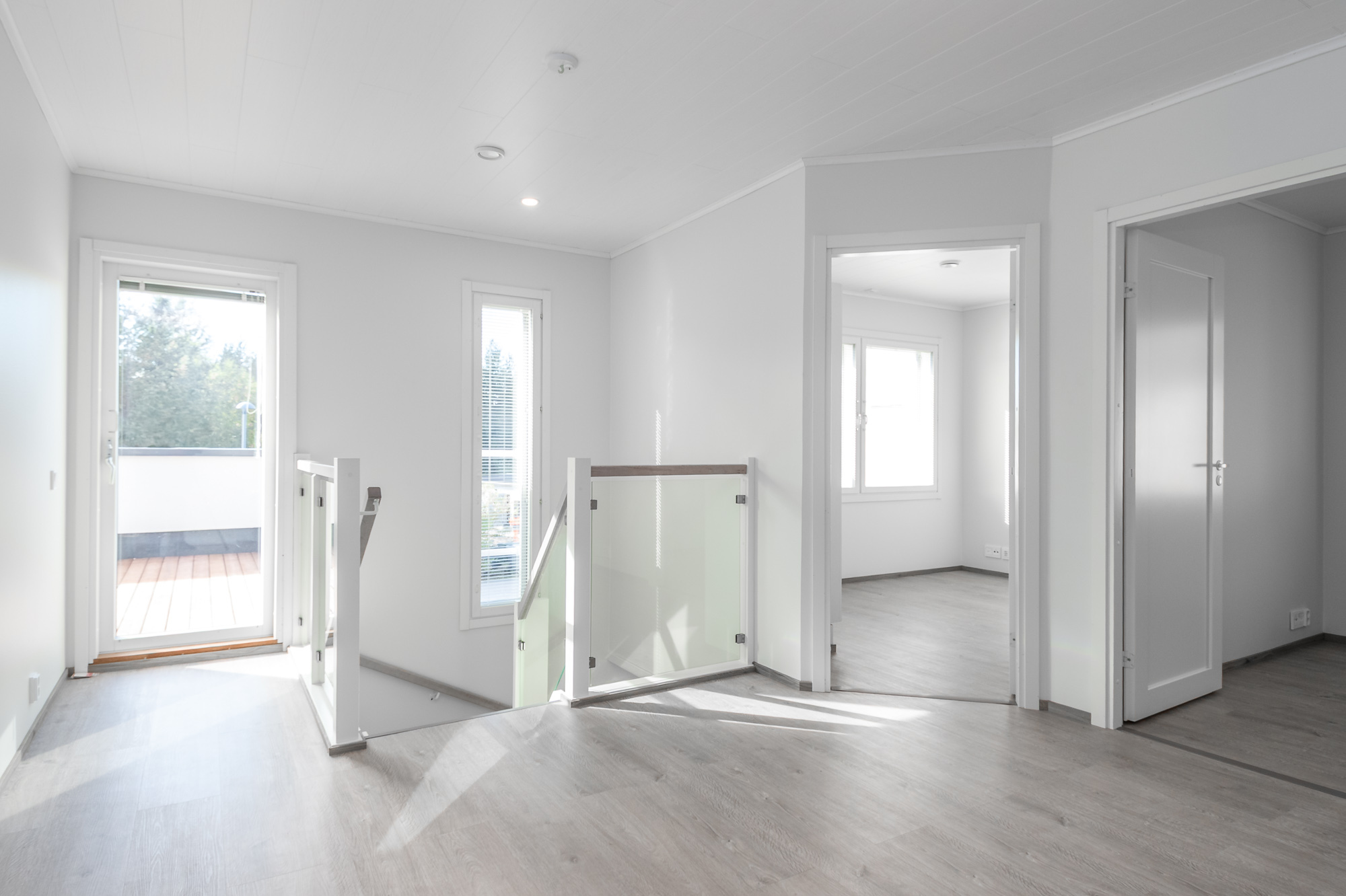 Yläkerrassa iso aulatila, mistä kulku isolle (16 m²) lounaan suuntaiselle terassiparvekkeelle upein näkymin. Ylhäällä niin ikään kaksi suurempaa makuuhuonetta ja yksi pienempi, joko lastenhuoneeksi tai työhuoneeksi sopiva huone.