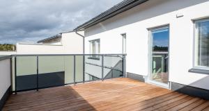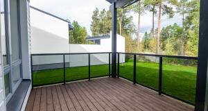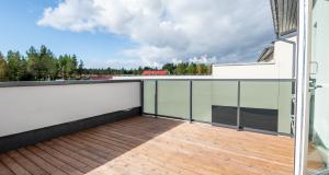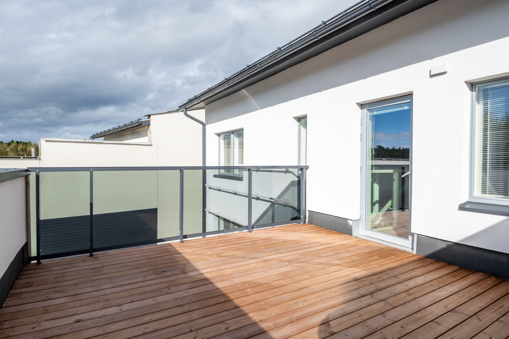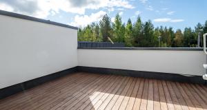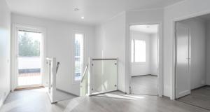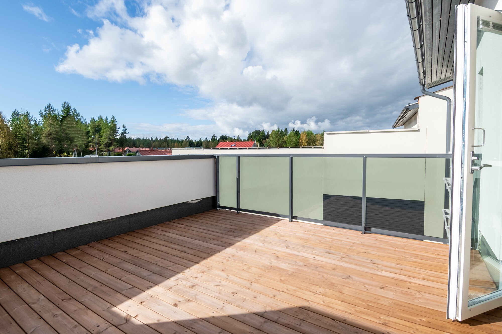 På övre våningen finns också en stor aula med utgång till en stor terrassbalkong (16 m²) i sydvästläge med fantastisk utsikt. Där uppe finns även två större sovrum samt ett mindre rum som lämpar sig som barnrum eller arbetsrum.