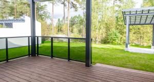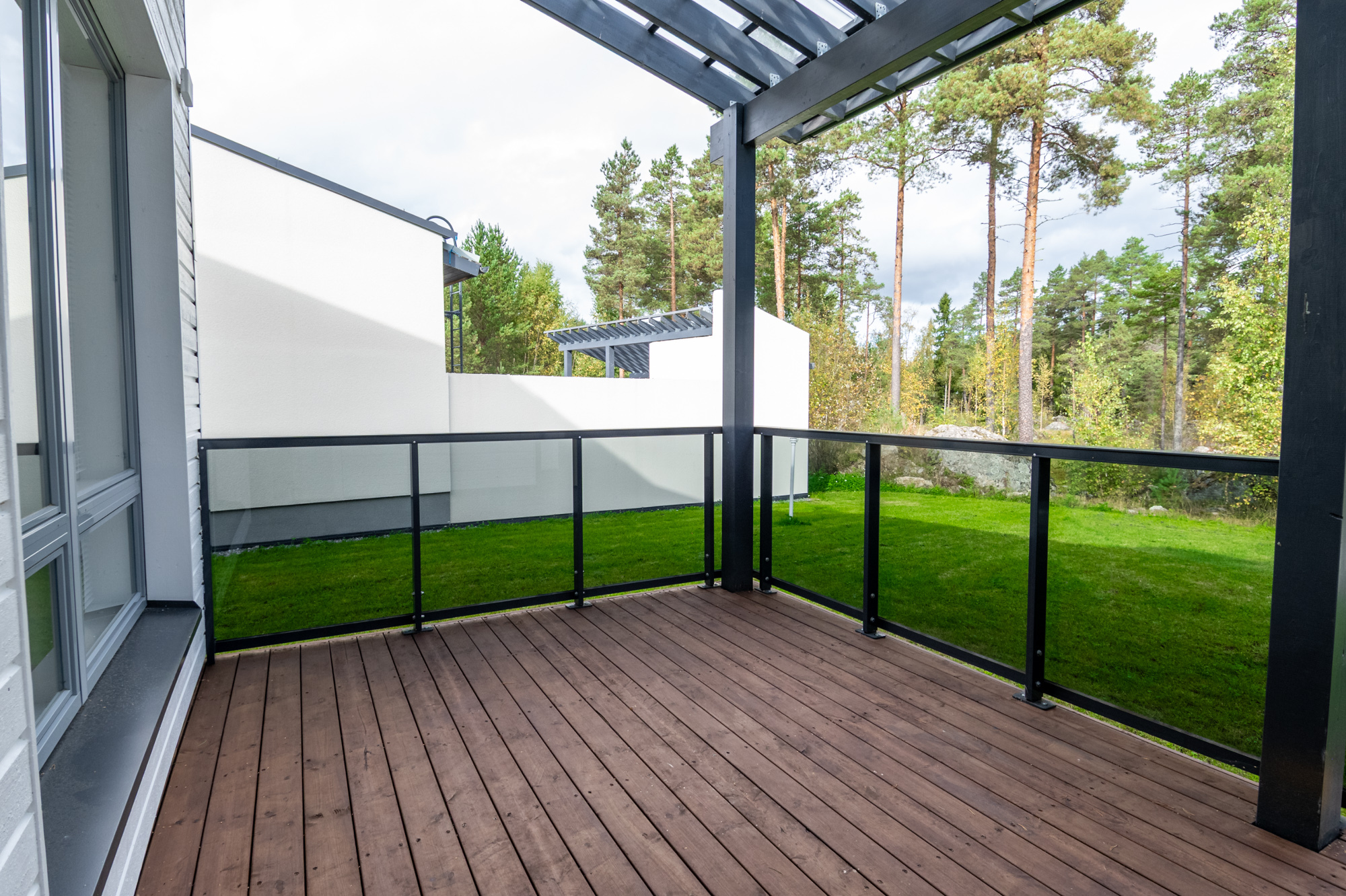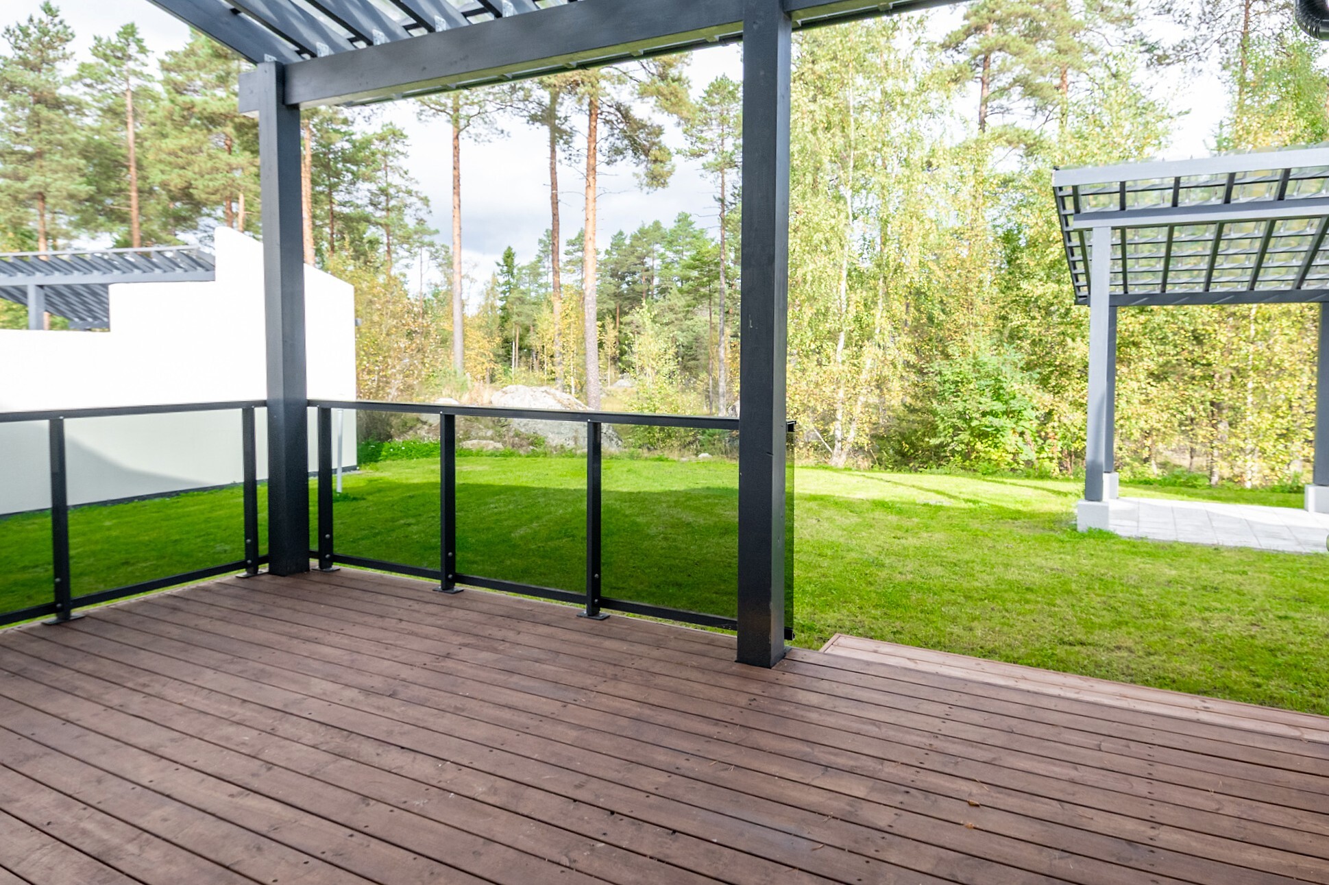 Tomten gränsar till grönområde. På trädgårdssidan finns en täckt terrass samt en pergola med tak och stenlagt golv.
