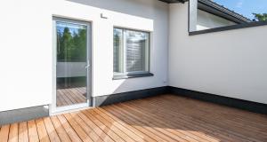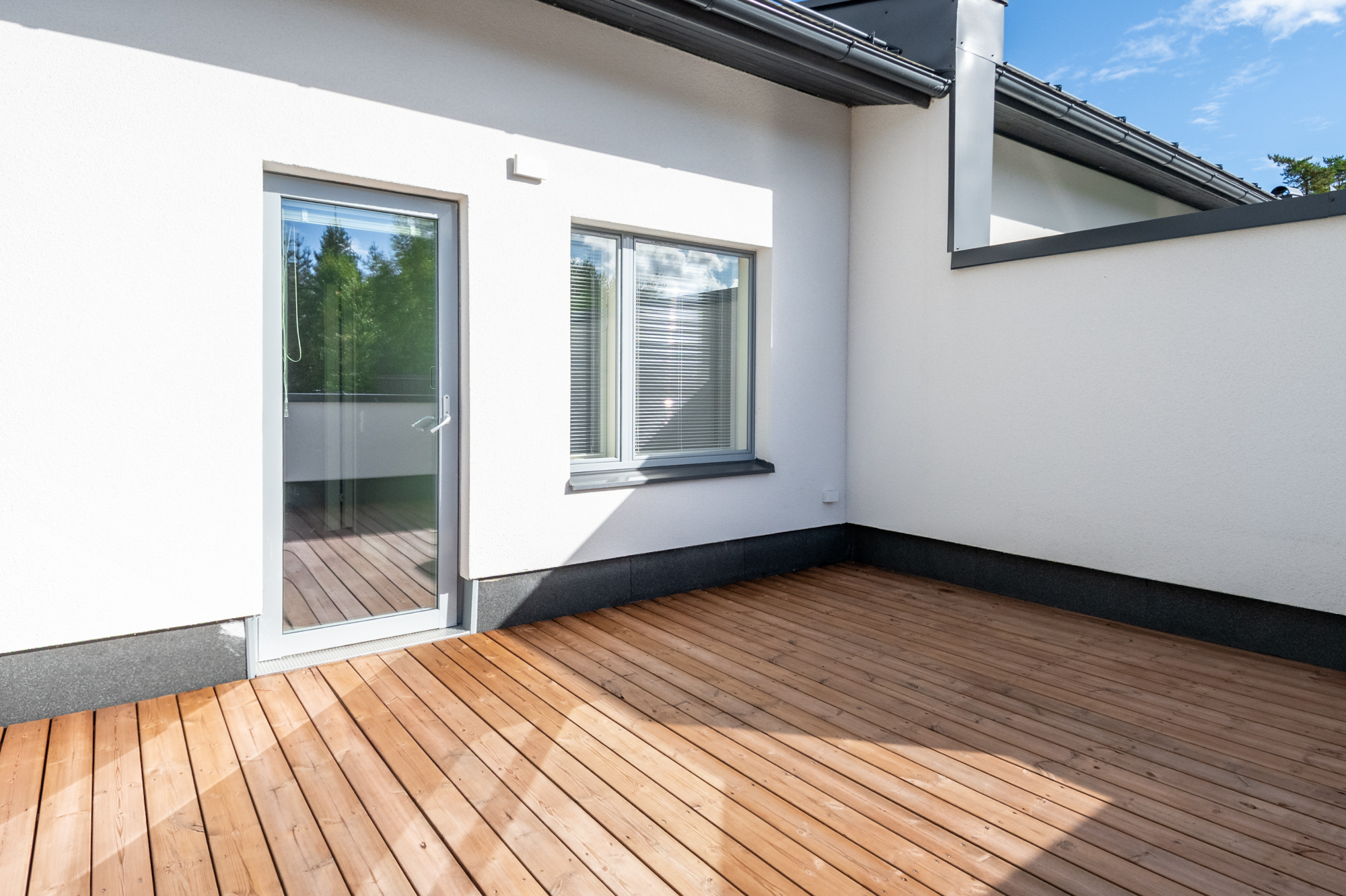 Tontti rajoittuu viheralueeseen. Puutarhan puolella on katettu terassi sekä valokatettu pergola kivilaatoitetulla lattialla.