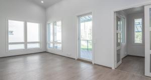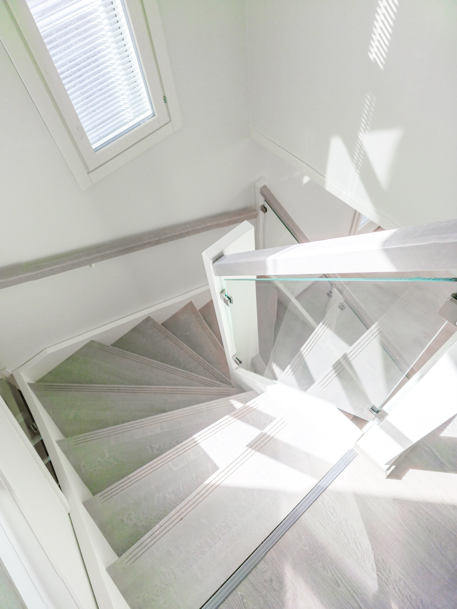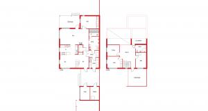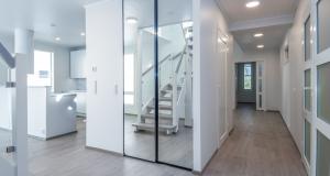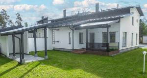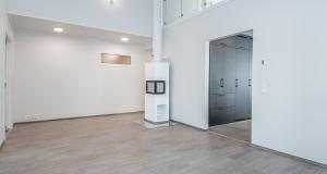På nedre våningen finns en rymlig entré, modernt kök i anslutning till matsalen, vardagsrum med full takhöjd i två våningar, med cirkulationskamin och utgång till terrassen. Ett av de fyra sovrummen ligger på nedre våningen, tre på övre våningen.