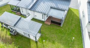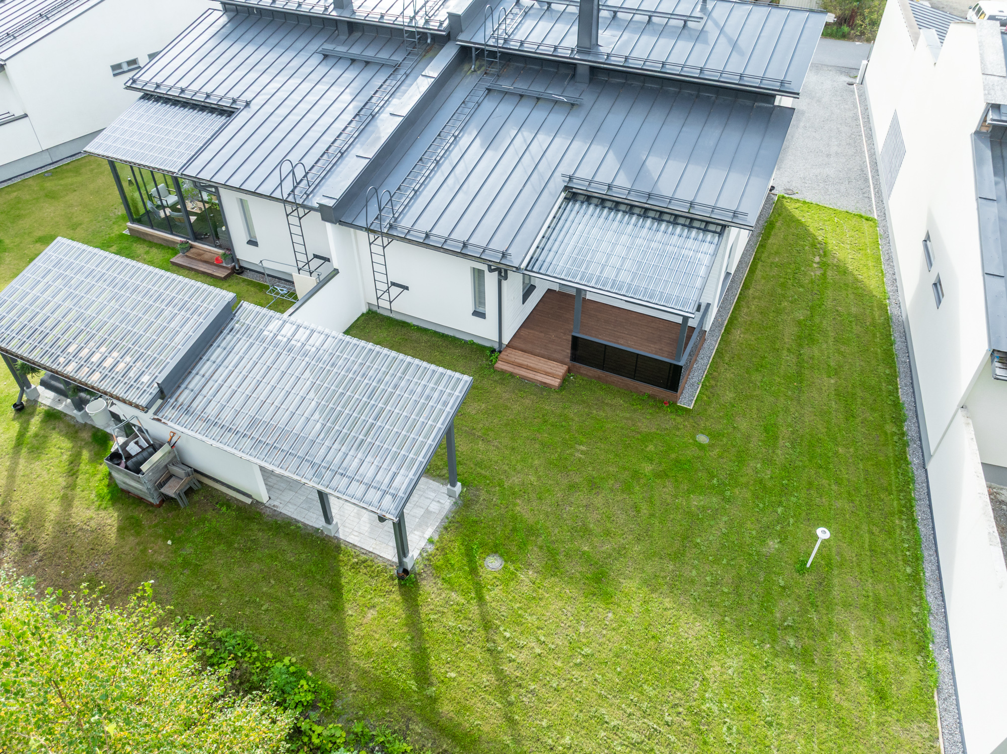 Biltak med plats för två bilar – i anslutning finns uppvärmt förråd och teknikrum. Vid entrén finns dessutom ett 16 m² stort täckt utrymme!