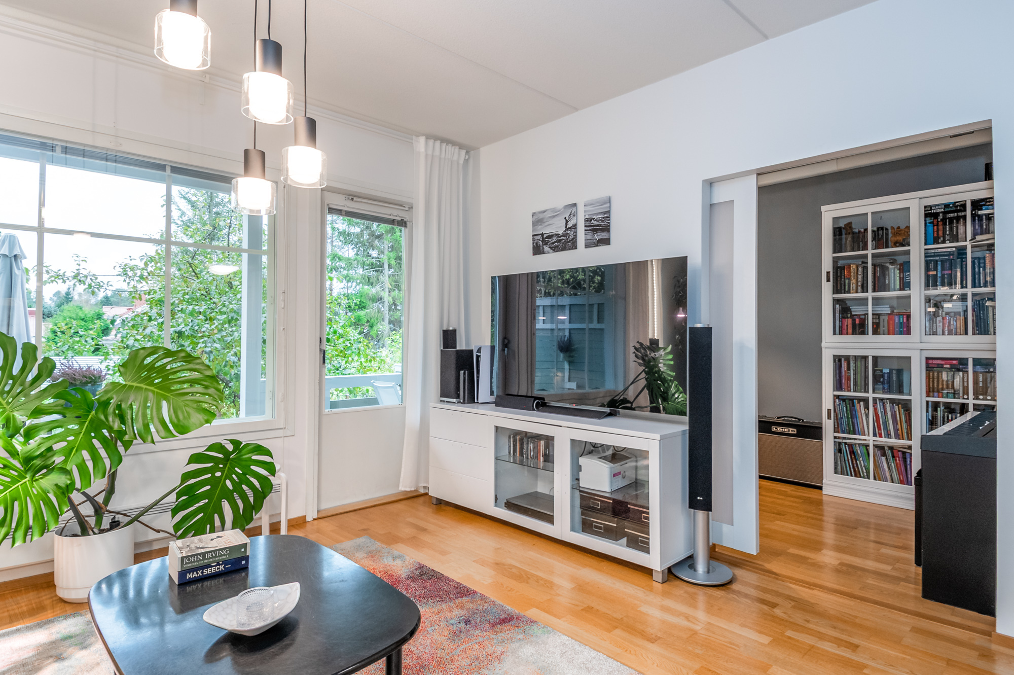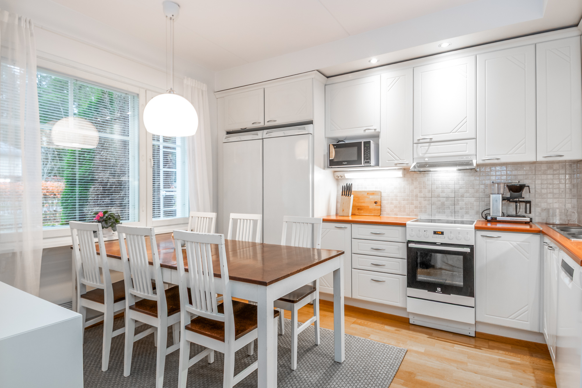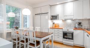 Valoisa, tilava keittiö. Jääkaapi, pakastin, induktioliesi, liesituuletin, astianpesukone.