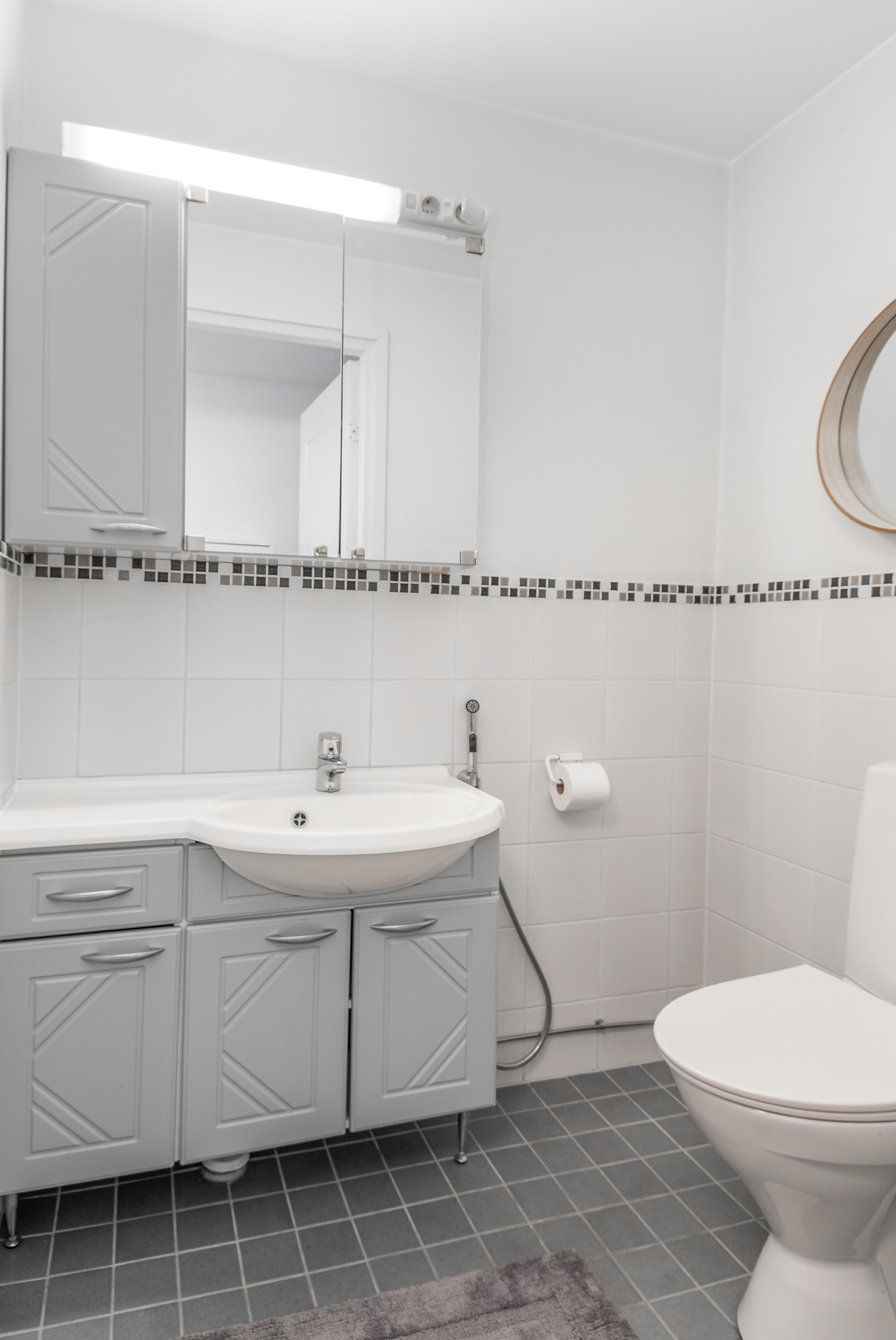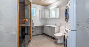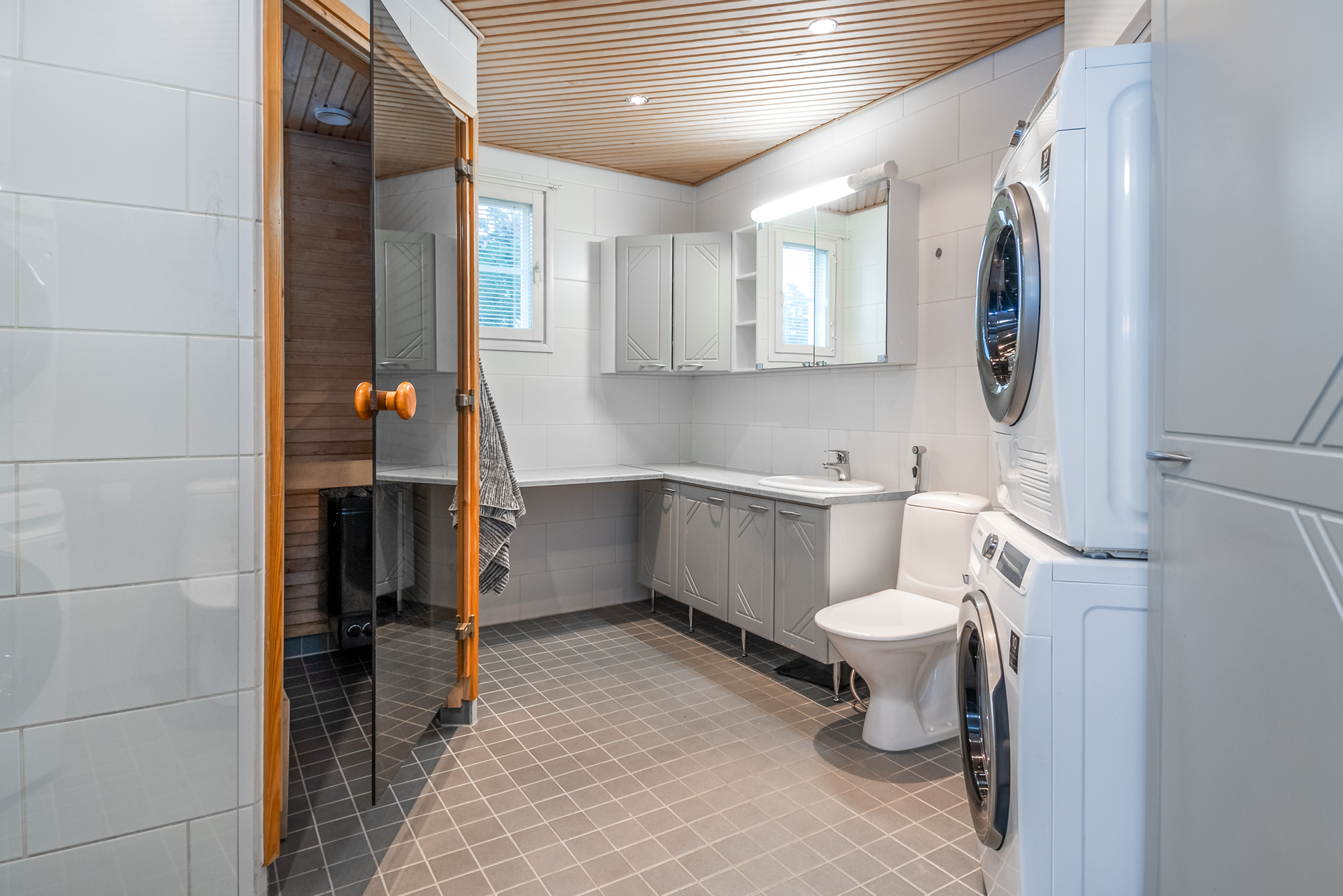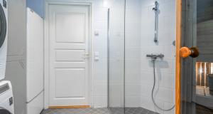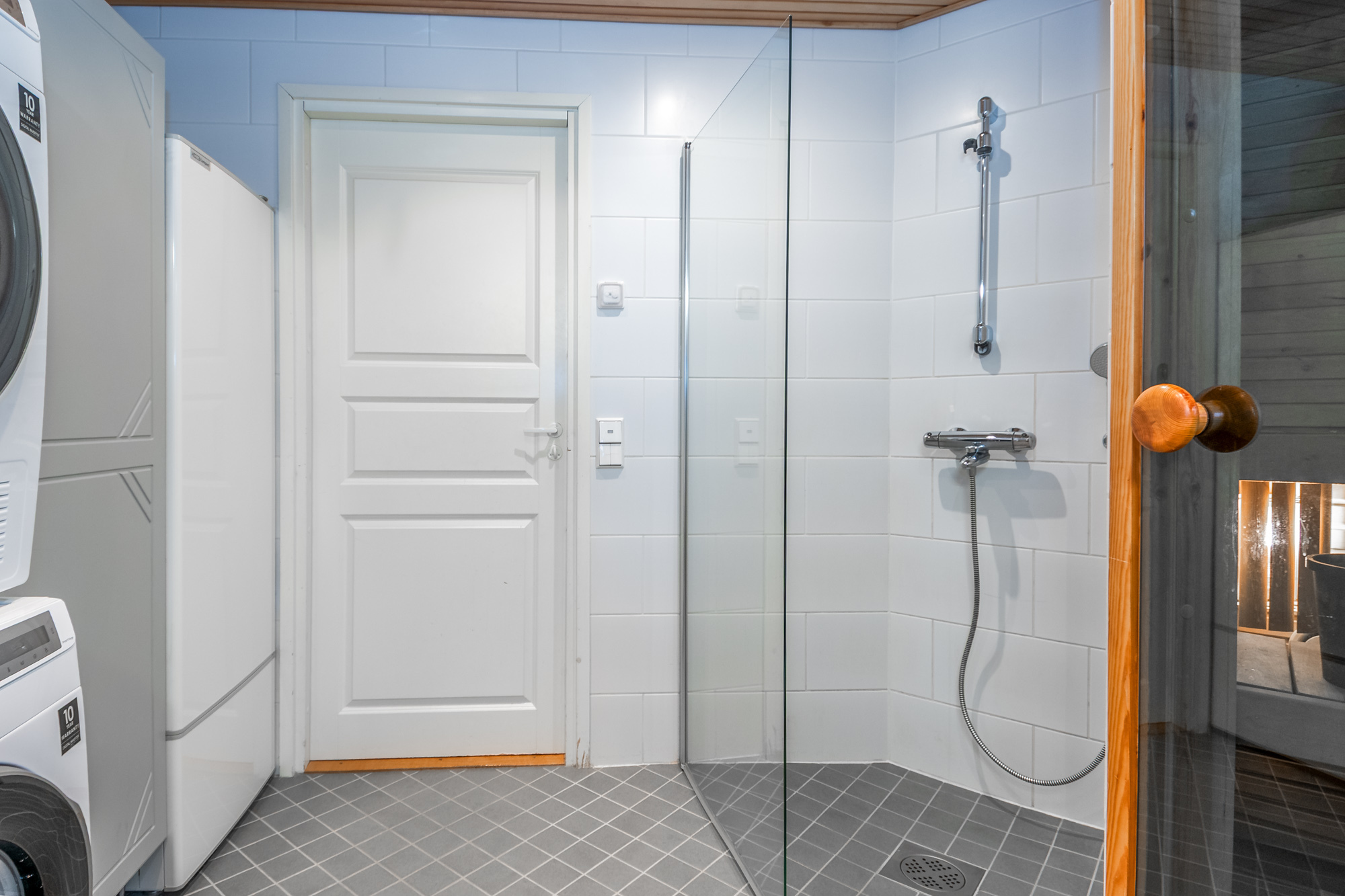 Tilava vaaleasävyinen kylpyhuone, lattialämmitys, suihkuovet, tilaa pesutornille.