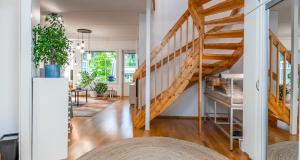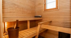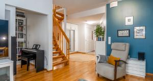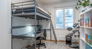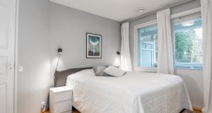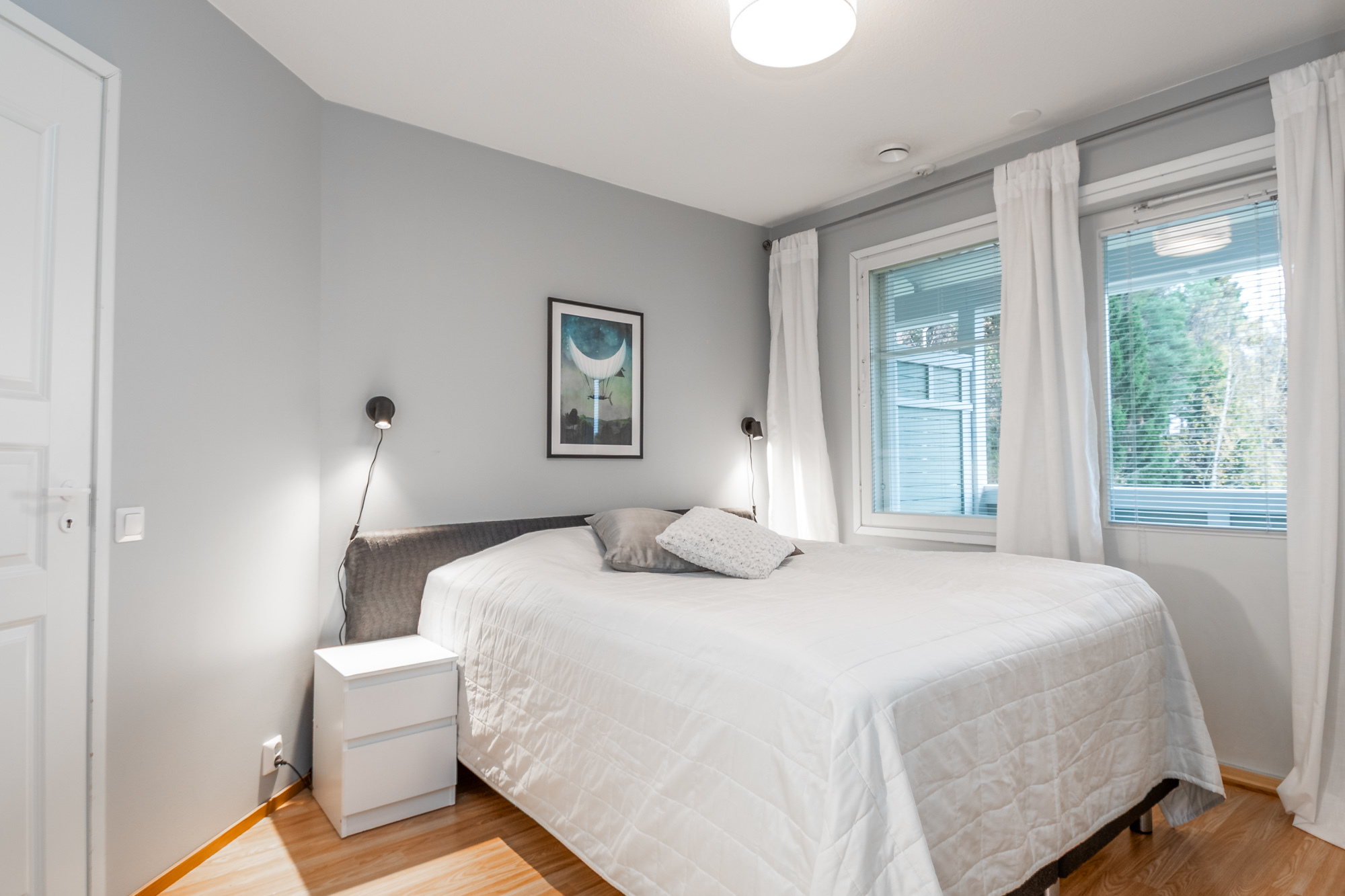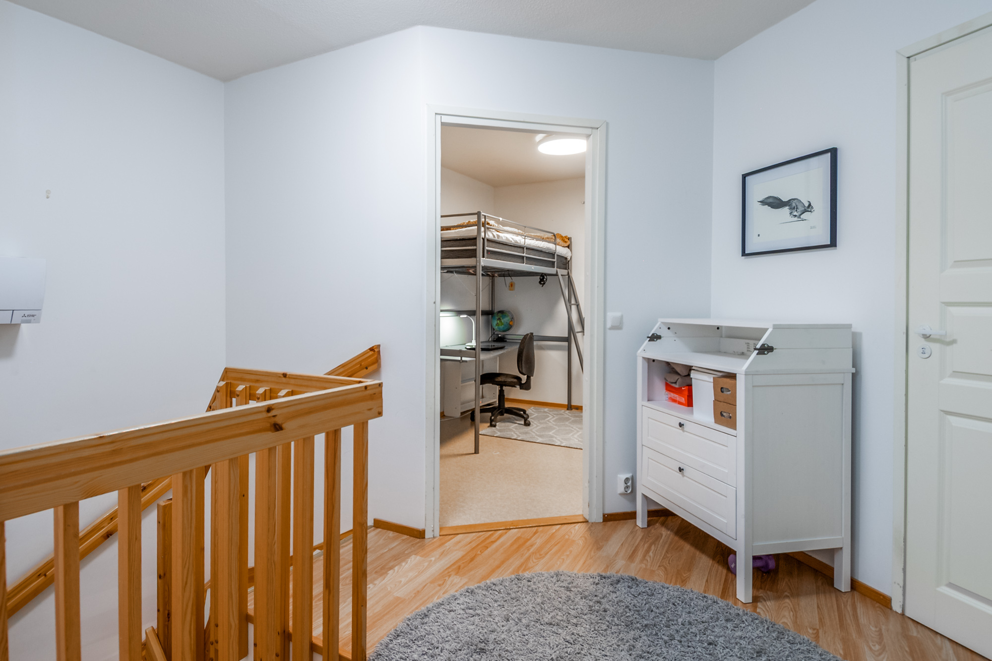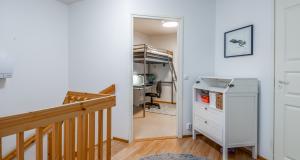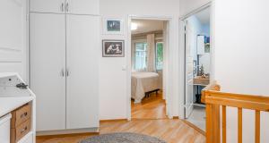 Ett sovrum på första våningen, som går även att användas som ett arbetsrum eller bibliotek. På övre våningen finns tre sovrum, en bastuavdelning samt en balkong som vetter mot sydväst. Förvaringsmöjligheterna är utmärkta: det största sovrummet har en klädkammare, dessutom finns ett uteförråd och en bruksvind.