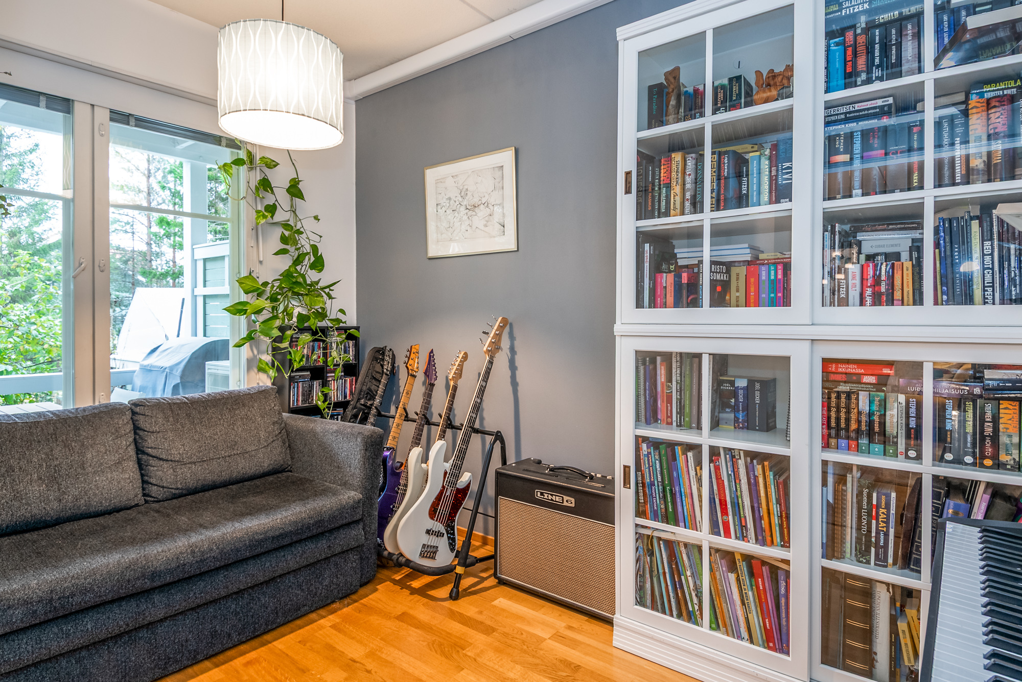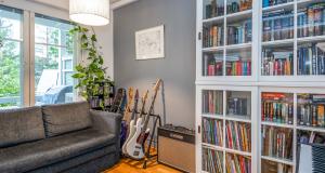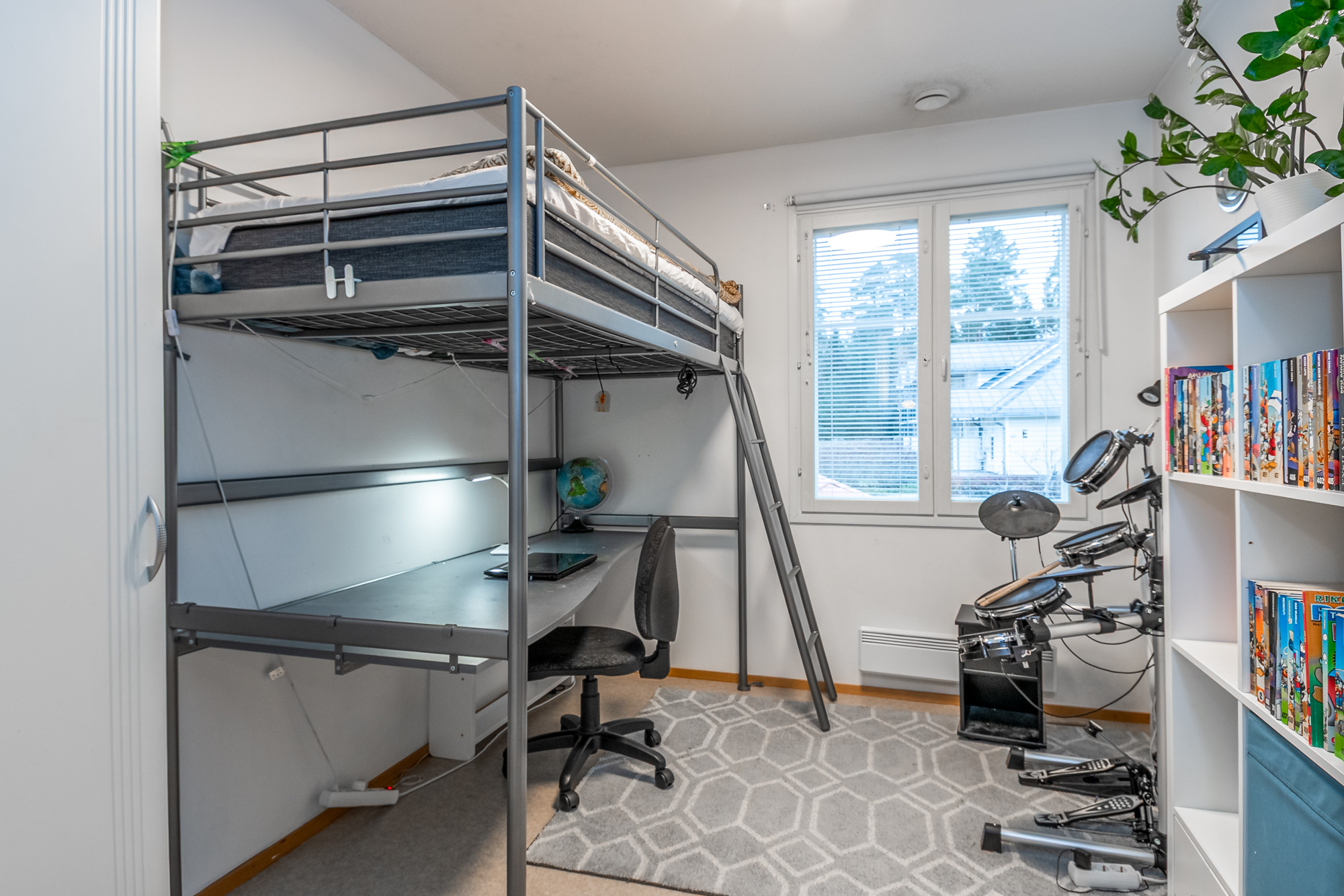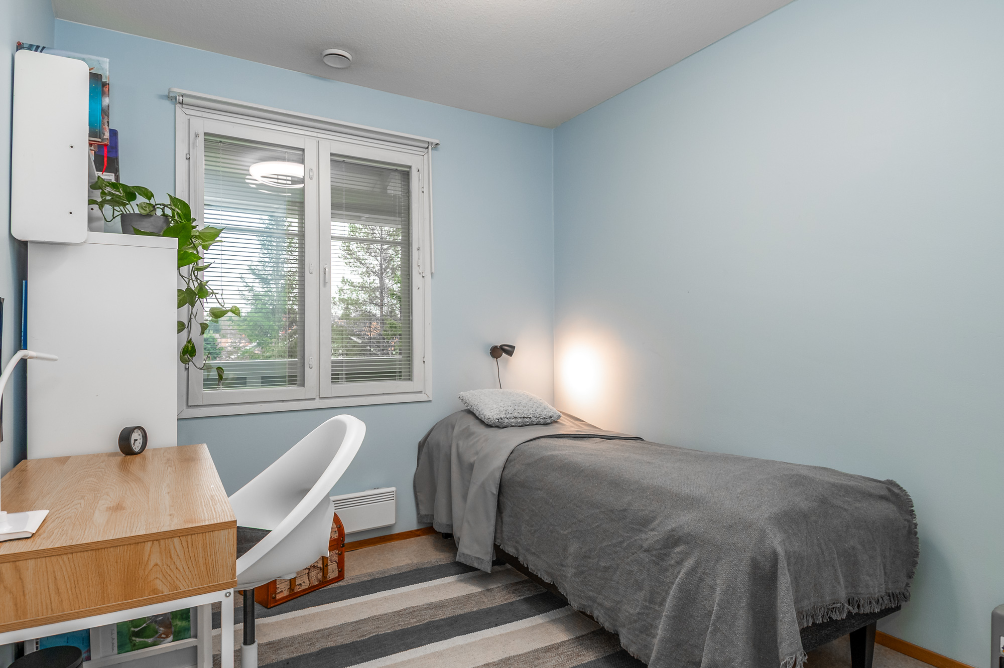 Ett sovrum på första våningen, som går även att användas som ett arbetsrum eller bibliotek. På övre våningen finns tre sovrum, en bastuavdelning samt en balkong som vetter mot sydväst. Förvaringsmöjligheterna är utmärkta: det största sovrummet har en klädkammare, dessutom finns ett uteförråd och en bruksvind.