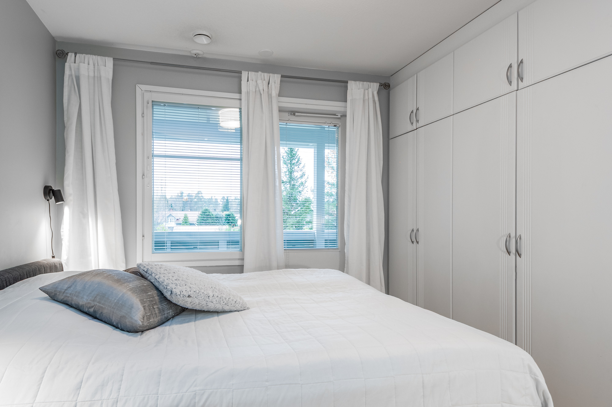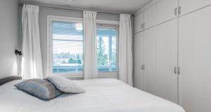 Yksi makuuhuone alakerrassa olohuoneen yhteydessä. Kolme makuuhuonetta toisessa kerroksessa. Toisesta makuuhuoneesta kulku lounaisparvekkeelle. Päämakuuhuoneen yhteydessä vaatehuone, muissa yläkerran makuuhuoneissa vaatekaapistot.