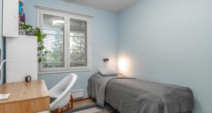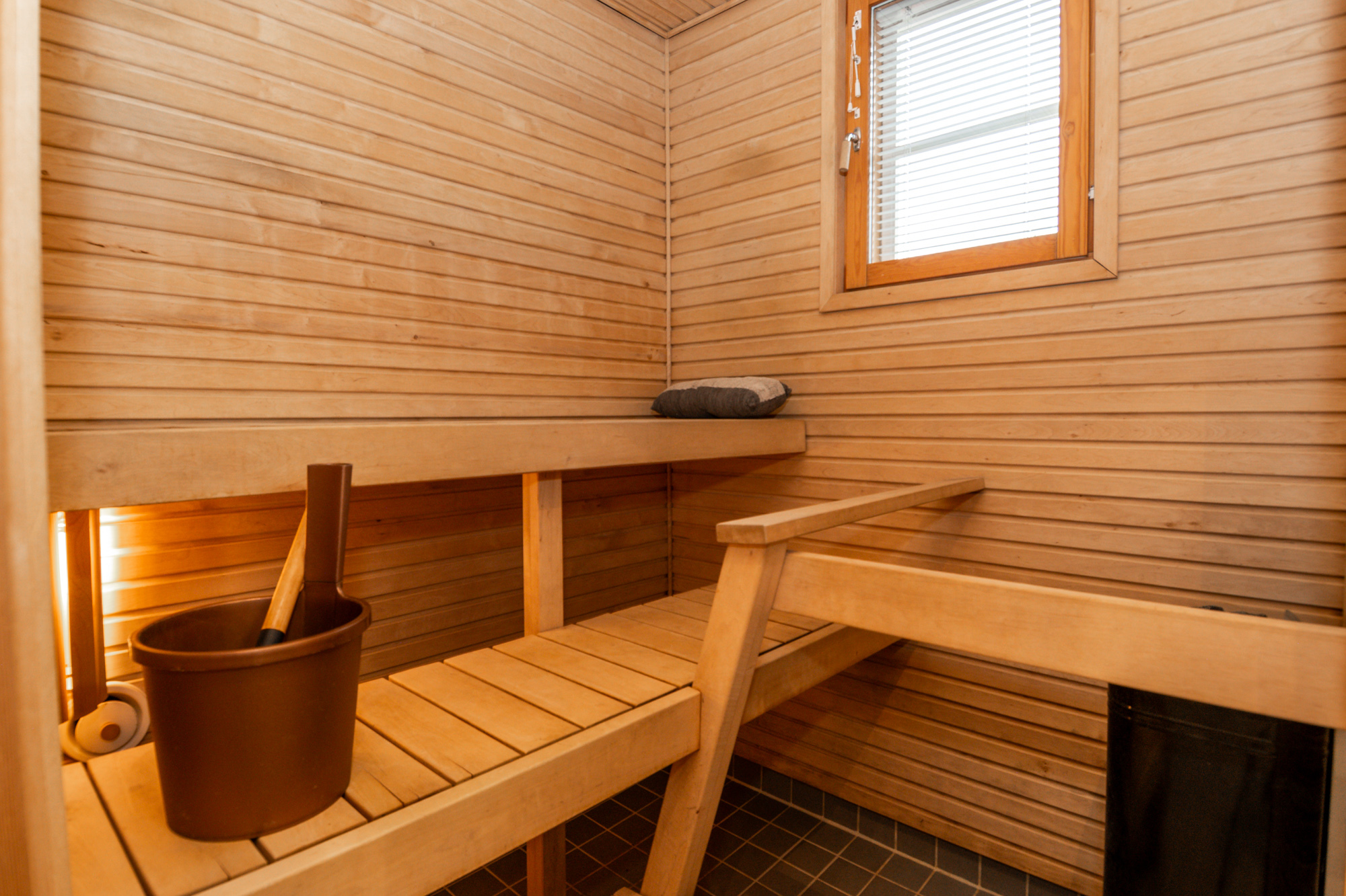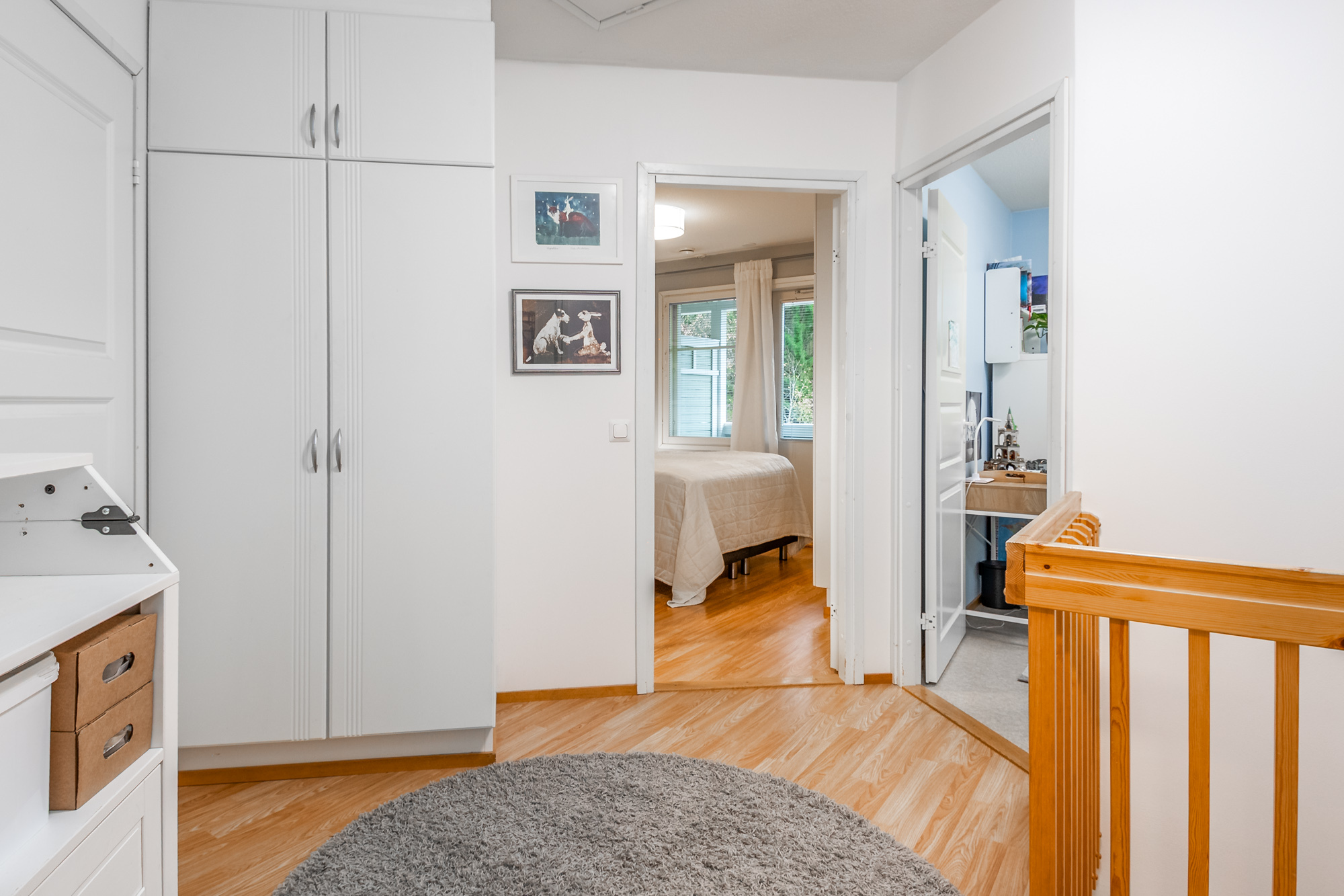 Yksi makuuhuone alakerrassa, joka soveltuu myös työhuoneeksi tai kirjastoksi. Yläkerrassa kolme makuuhuonetta, saunaosasto sekä lounaaseen avautuva parveke. Säilytystilat ovat erinomaiset: Päämakuuhuoneessa on vaatehuone ja asunnon yhteydessä on ulkovarasto sekä käyttöullakko.