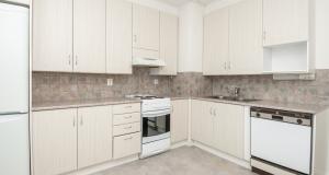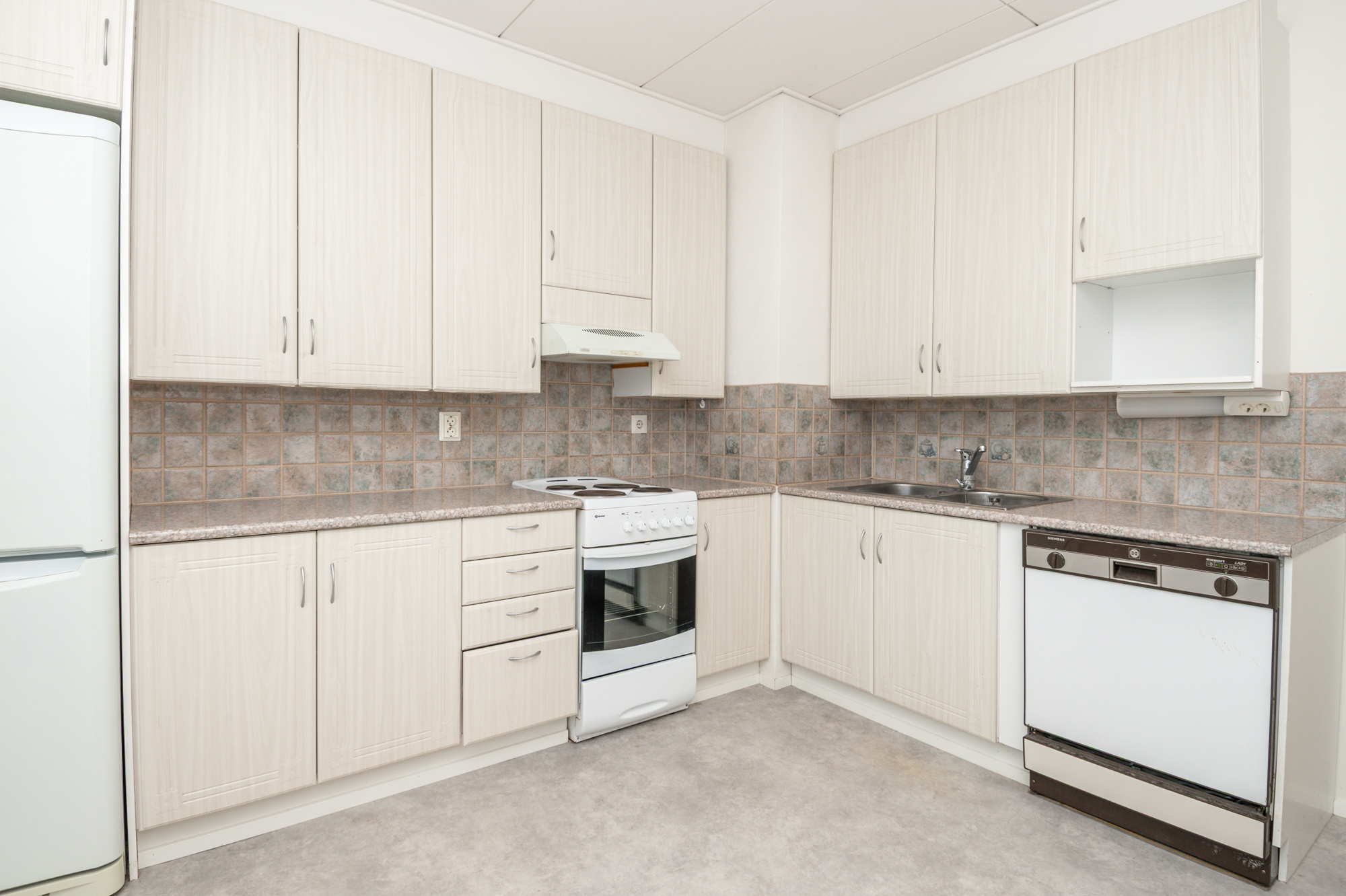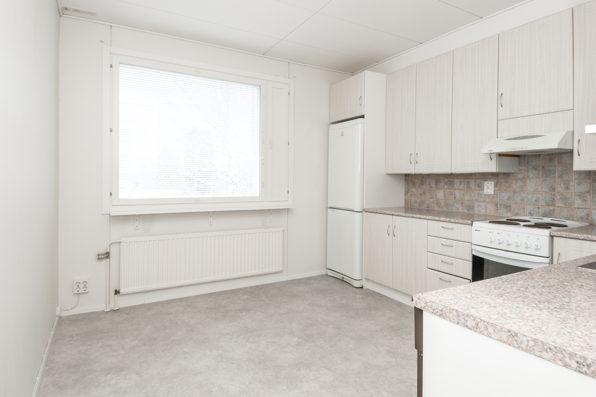Valoisa, tilava keittiö. Jääkaappi, pakastin, liesi, liesituuletin, astianpesukone.