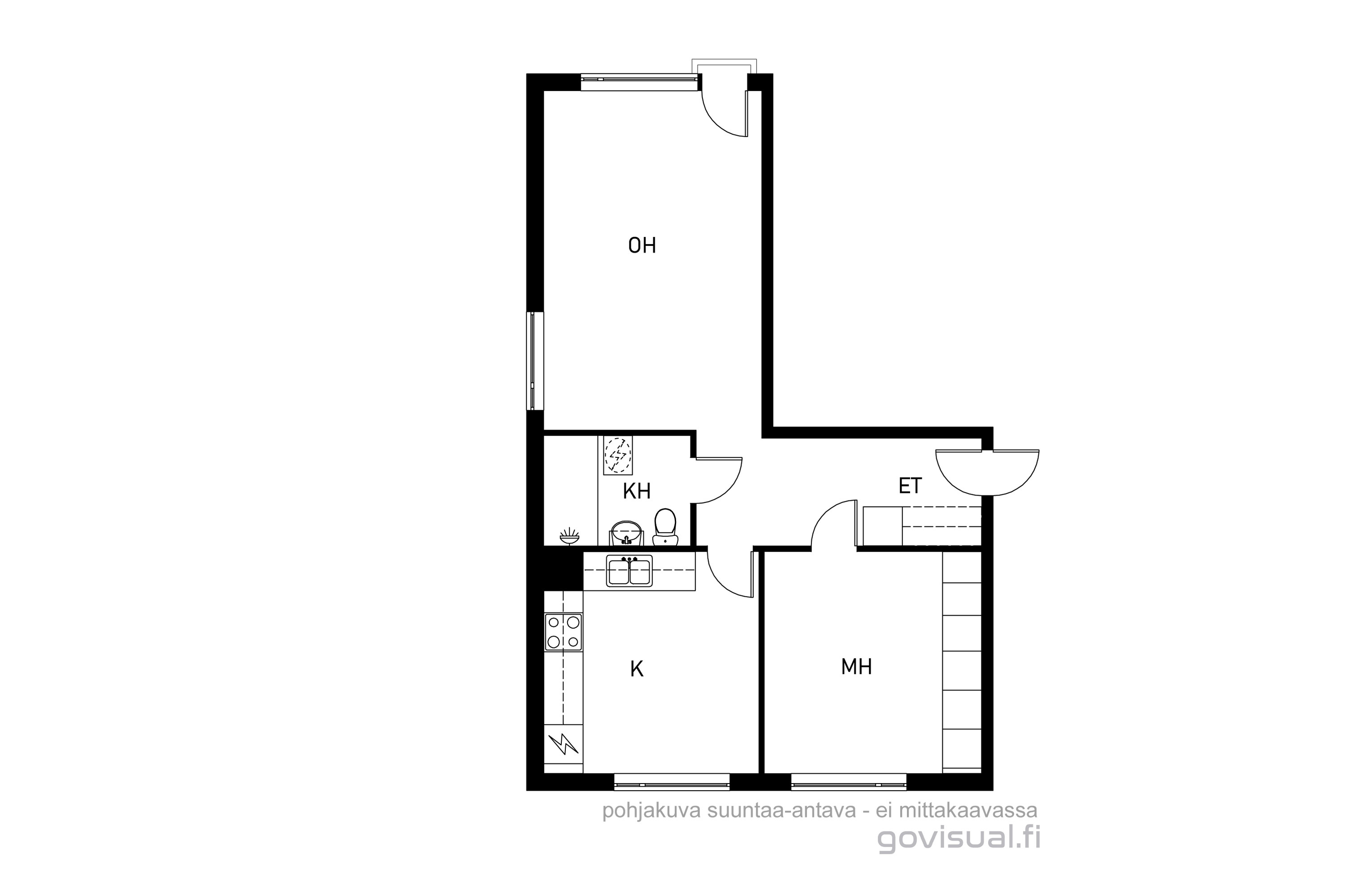 Toimiva pohjaratkaisu: tilava olohuone, josta on käynti ranskalaiselle parvekkeelle lounaaseen päin. Keittiössä on hyvin kaappi- ja työtilaa, kylpyhuoneessa pesukoneliitäntä.