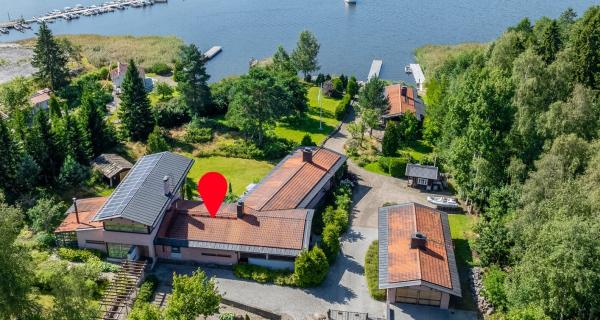 Det arkitektritade tegelhuset är byggt för att stå emot tidens tand, och i detaljerna märks kompromisslös kvalitet. Ek och tall återkommer genomgående – i parkettgolv, fönsterkarmar och innertakets ytor – och skapar en varm och gedigen atmosfär. Husets hjärta är det imponerande vardagsrummet, där takhöjden reser sig över sex meter och de stora fönstren släpper in naturen och ljuset som en del av inredningen. Utöver detta finns loft, separat sällskapsrum, inglasad terrass, sovrum, badrum, kök, matsal, bibliotek, arbetsrum samt två klädrum.