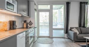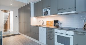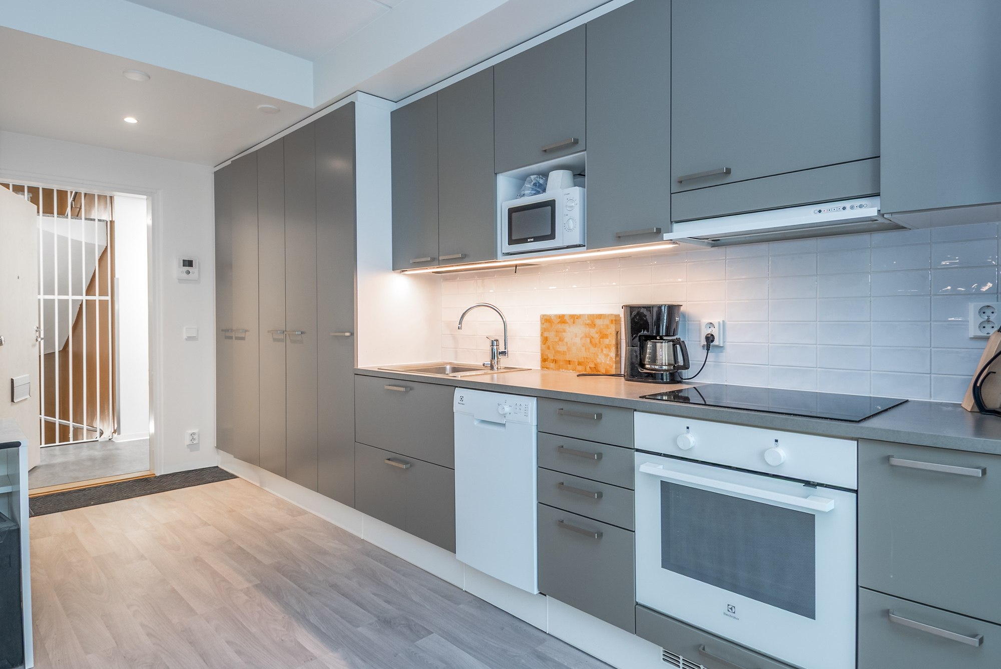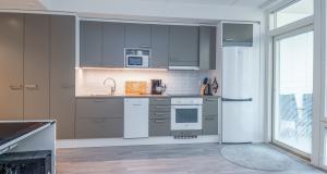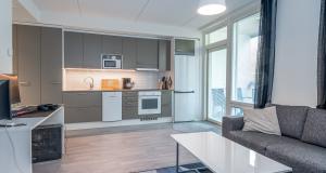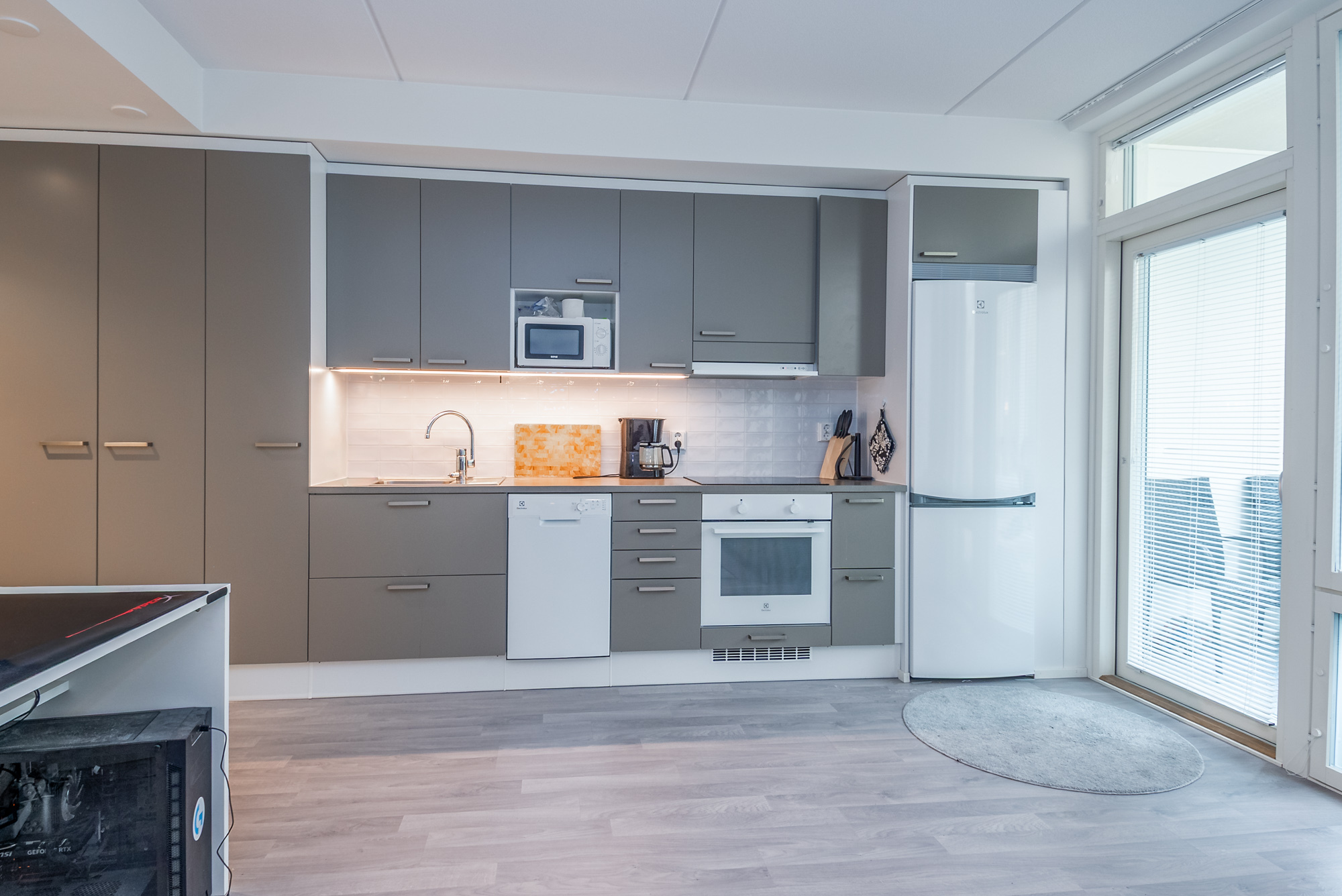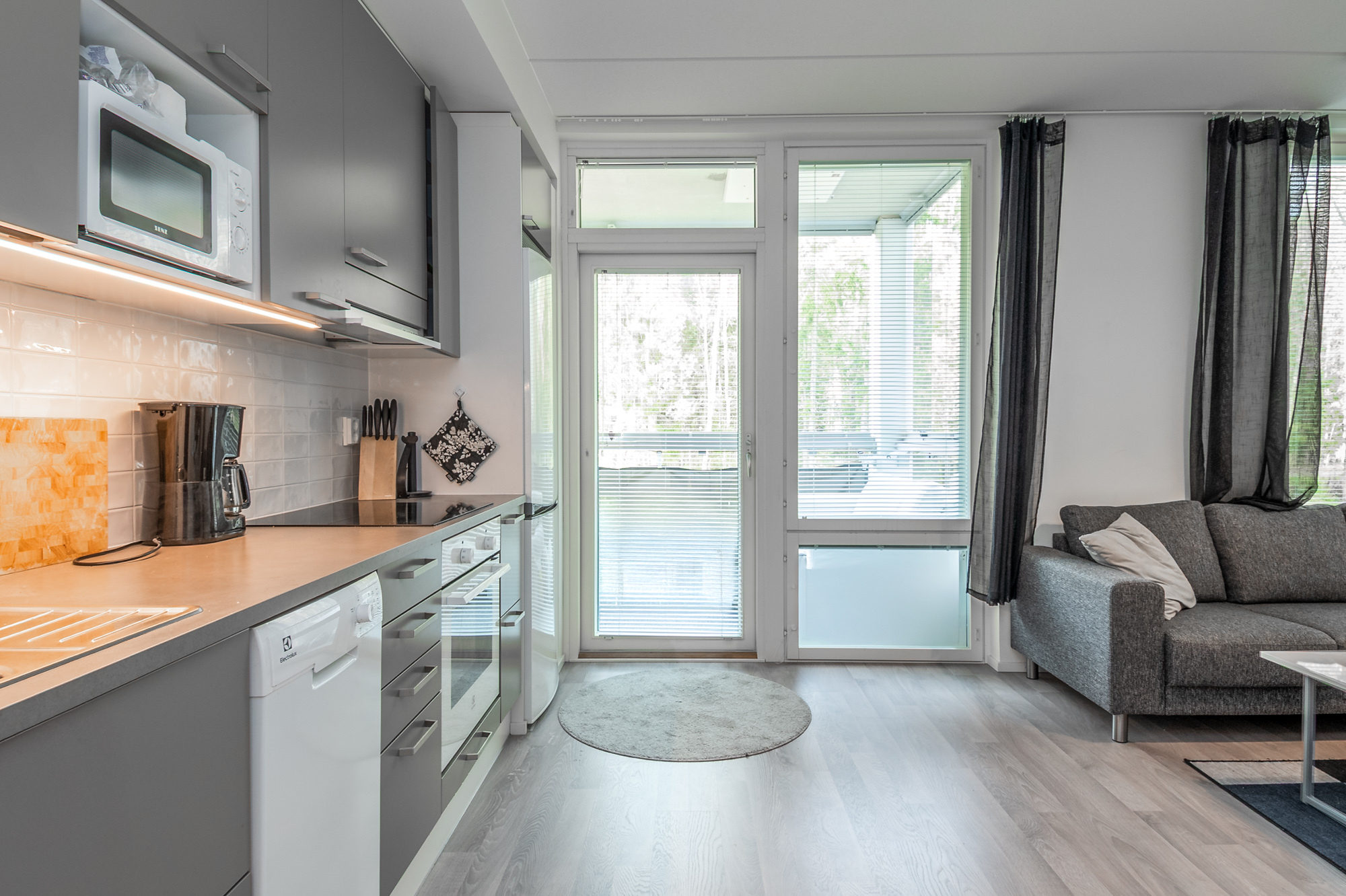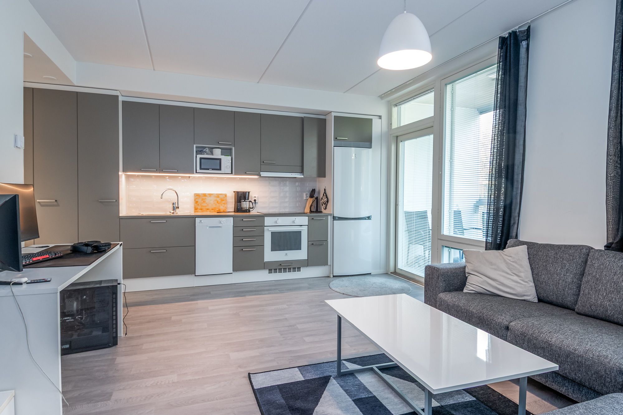 Keittiö ja olohuone yhtä tilaa. Jääpakastinkaappi, induktioliesi, liesituuletin, kalusteuuni, astianpesukone.