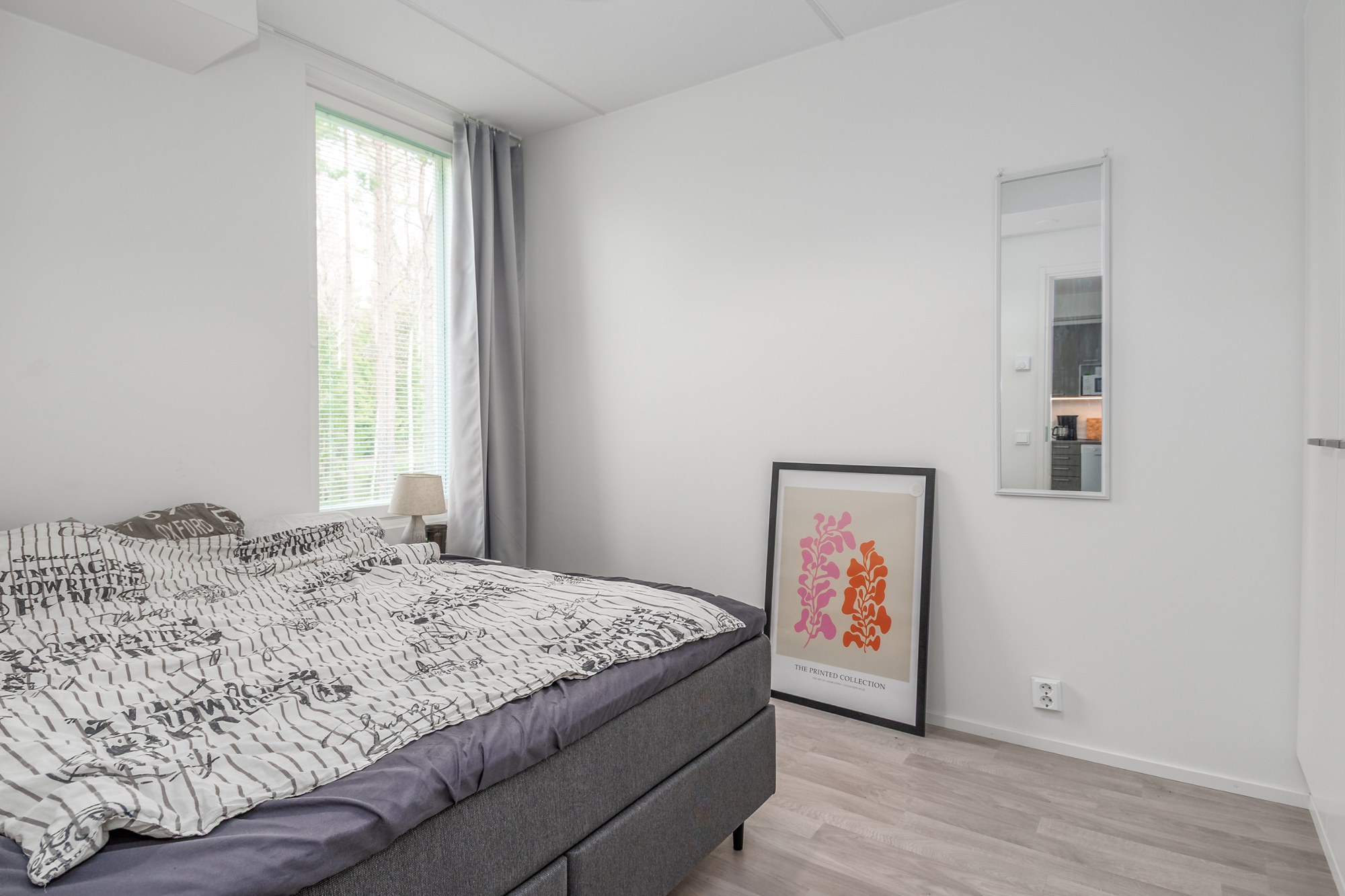 Tilava makuuhuone, missä vaatekaapisto.