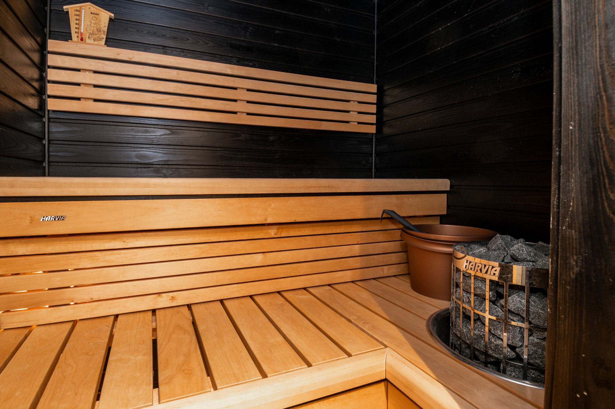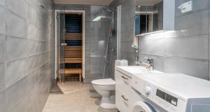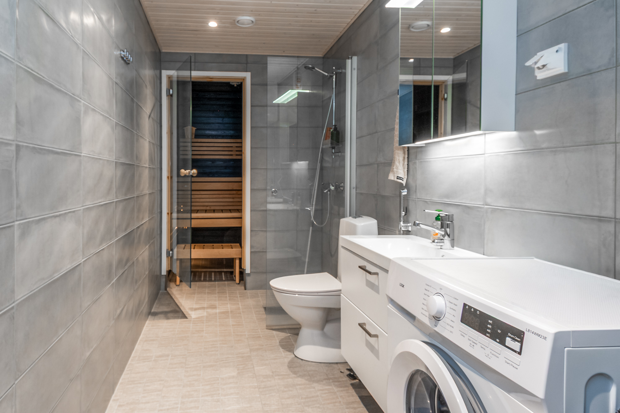 Tilava kylpyhuone oman saunan yhteydessä. Tilaa pesutornille.