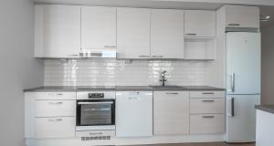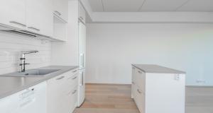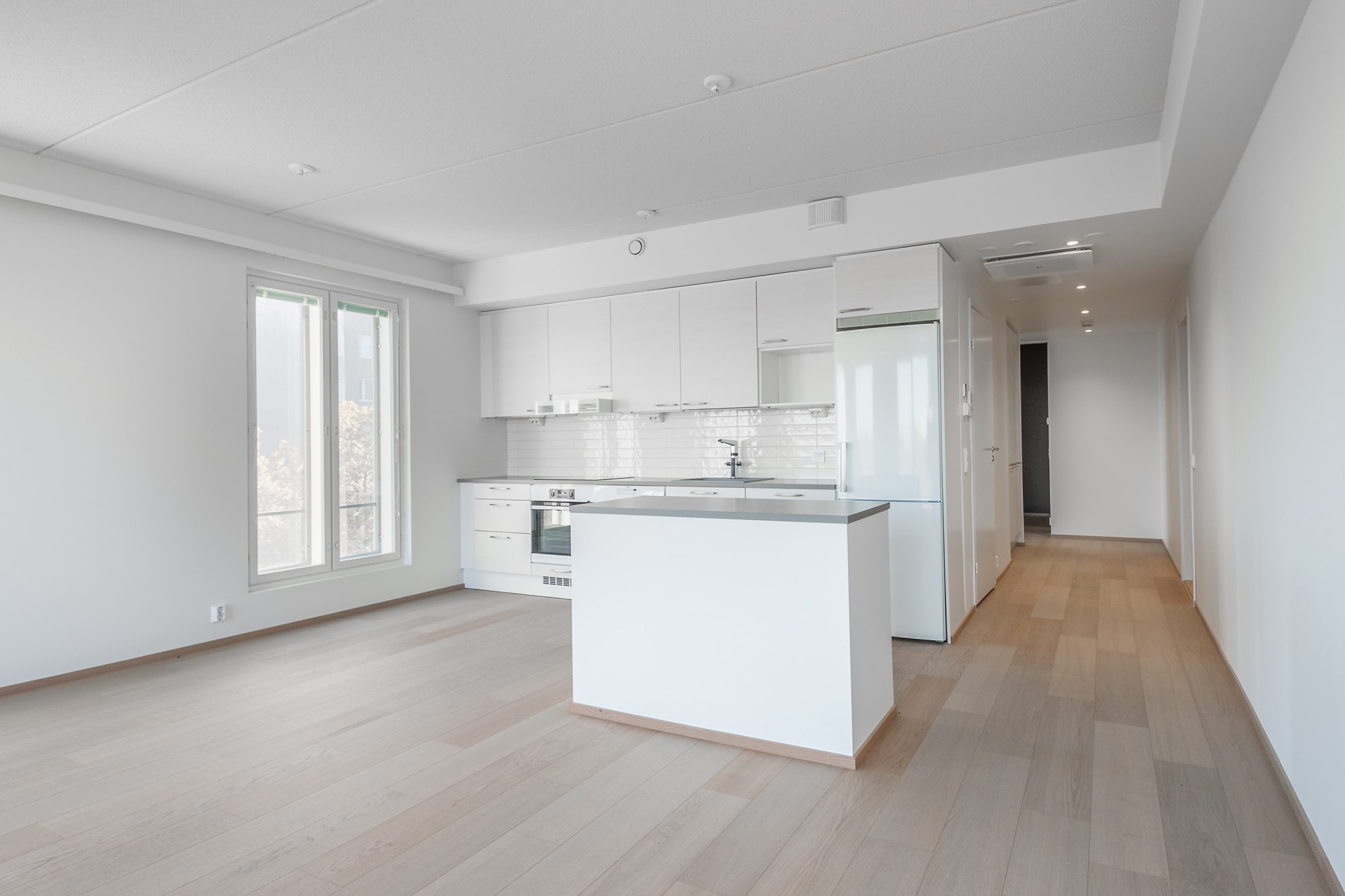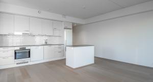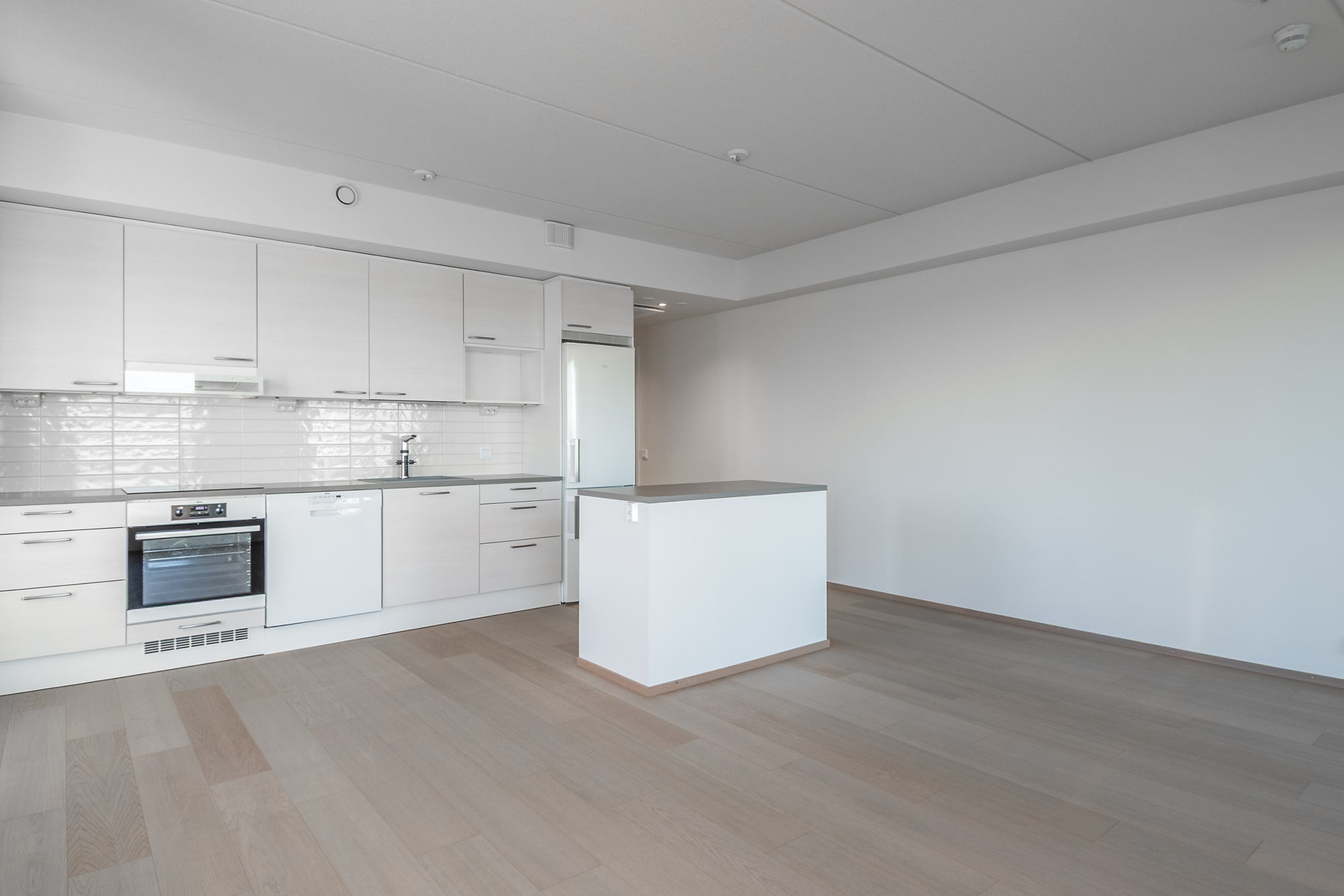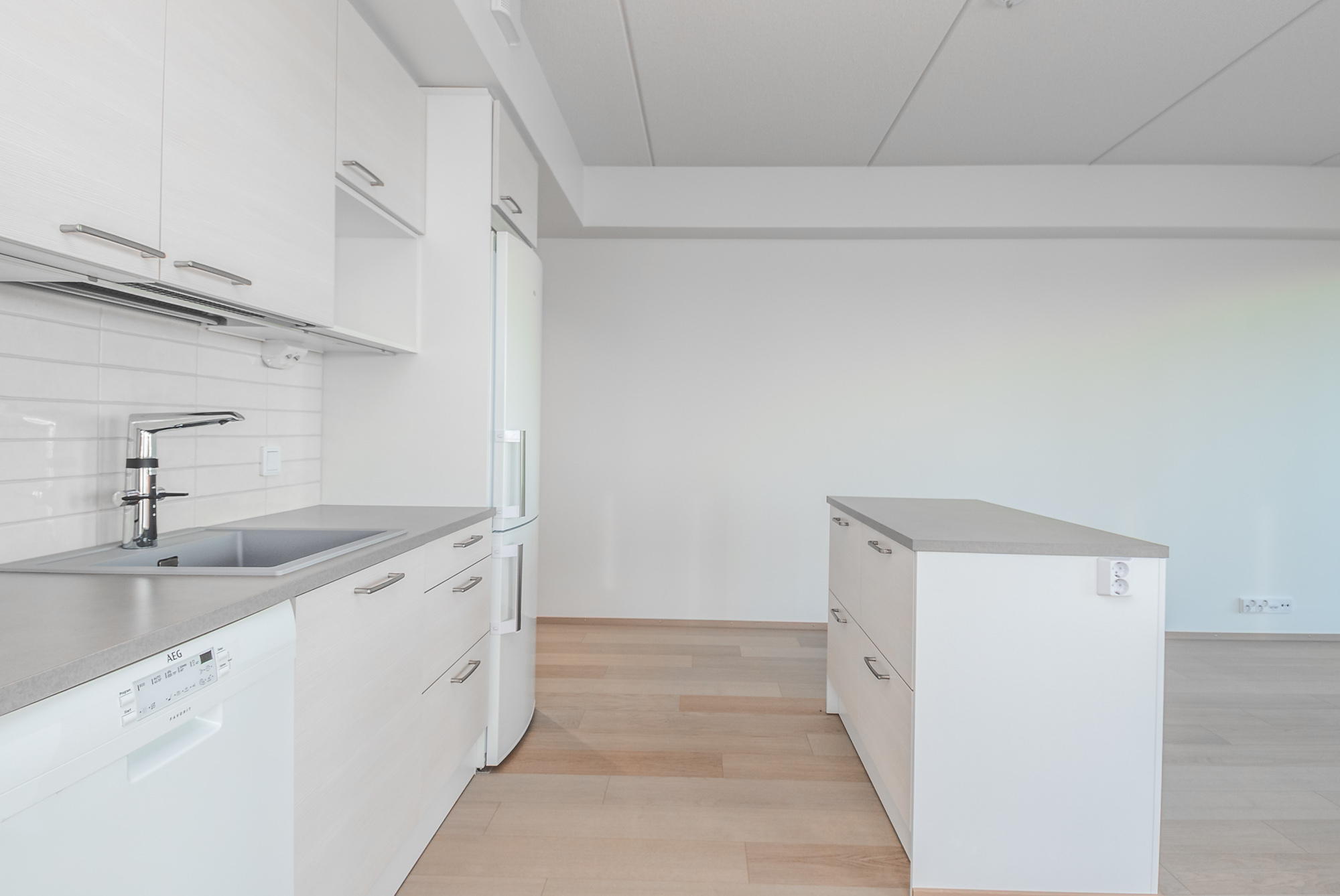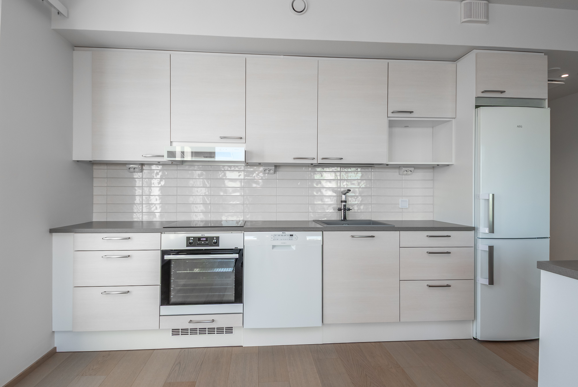 Keittiötila saarekkeella yhdistyy olohuoneeseen. Jääkaappi/pakastin, induktioliesi, liesituuletin, erillinen uuni sekä astianpesukone. Ohutpuulattia (tammi). Vesikiertoinen lattialämmitys.