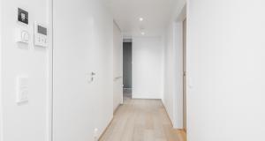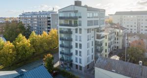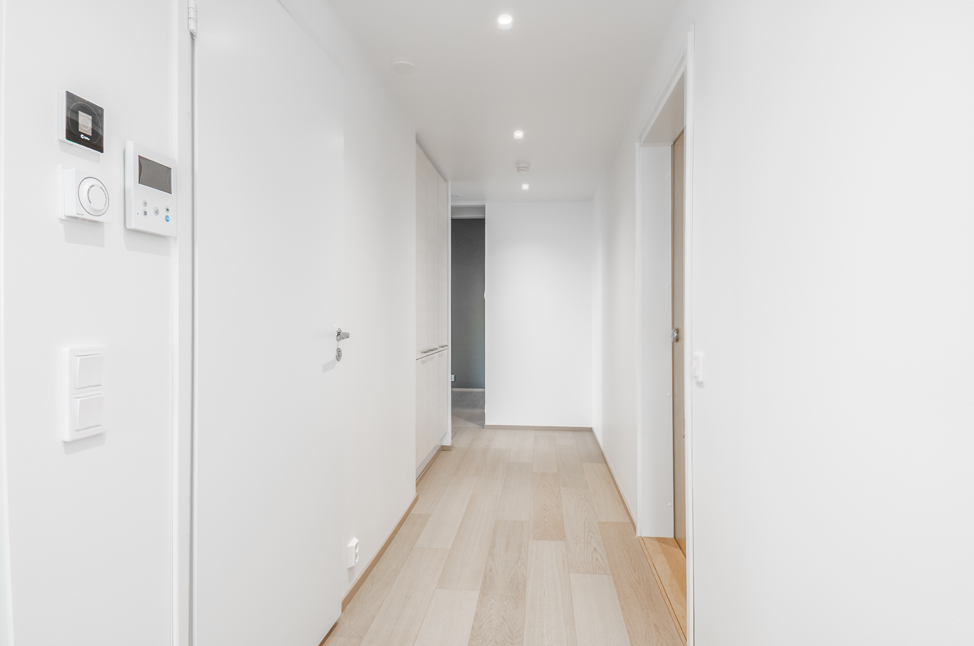 Detta nybyggda objekt är smakfullt inrett. Det rymliga köket med köksö är i öppen förbindelse med det ljusa vardagsrummet, varifrån man har utgång till den inglasade balkongen. Båda sovrummen har egna klädrum, och det ena dessutom en fransk balkong. I alla rum finns ett vackert parkettgolv i ek. I badrummet finns plats för en tvättmaskin och torktumlare. Hela lägenheten har vattenburen golvvärme samt mekanisk ventilation och kylning.