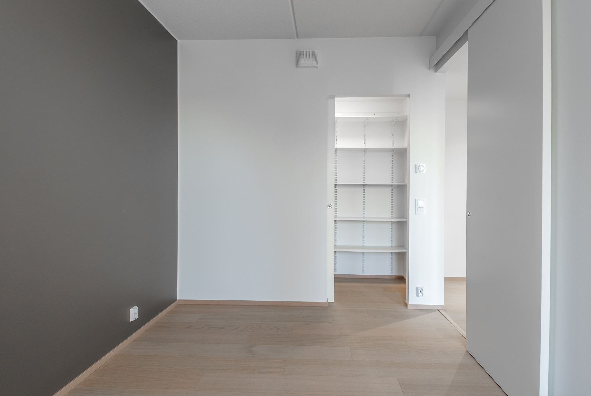 Molemmissa makuuhuoneissa oma vaatehuone, toisessa ranskalainen parveke. Ohutpuulattia (tammi). Vesikiertoinen lattialämmitys.