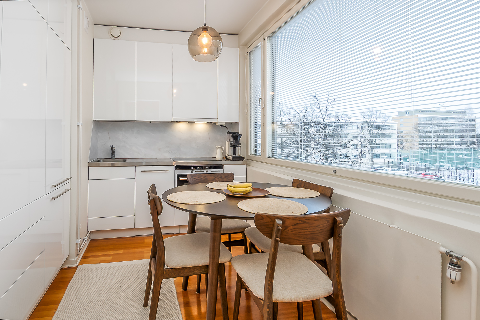 Eirttäin hyväkuntoinen, kokonaan remontoitu keittiö. Integroidut jääpakastinkaappi ja astianpesukone. Kalusteuuni, induktioliesi, liesituuletin. Erillinen ruokailutila keittiön yhteydessä - mahdollisuus käyttää myös työtilana.