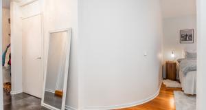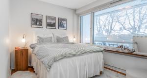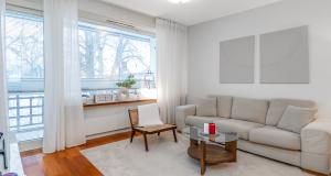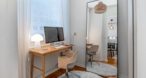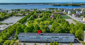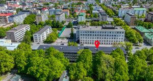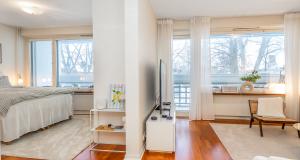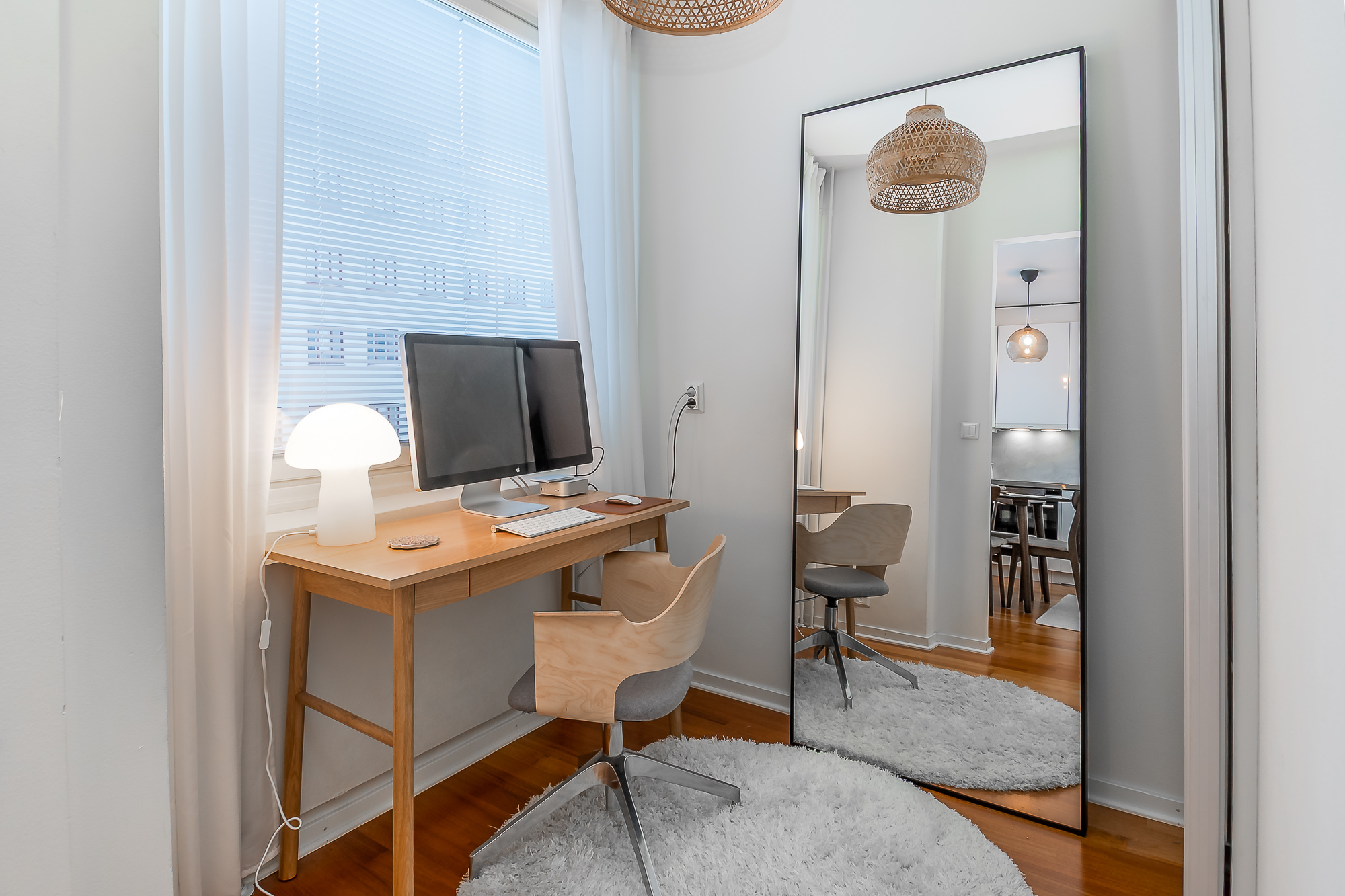 Suojaiset, vehreät näkymät länteen taloyhtiön puistomaiselle piha-alueelle ja Kasarminalueelle (olohuone, makuuhuone) ja itään Raastuvankadulle (keittiö, työtila).