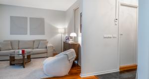 Erittäin tyylikäästi suurennettu ja remontoitu kylpyhuone, missä erillinen kodinhoitotila. Kylpyamme. Kylpyhuoneen ja olohuoneen välissä iso, maitolasinen ikkuna antaa luonnonvaloa kph:een. Lattialämmitys.